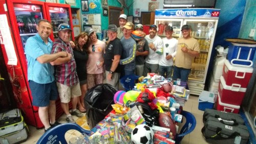 This is Shawn Westberg’s gang of merry men making faces at the camera with Jill after bringing about 6 ice chests full of school supplies, sporting goods, clothes, hygiene items and more for our “Pack for a Purpose” program.
