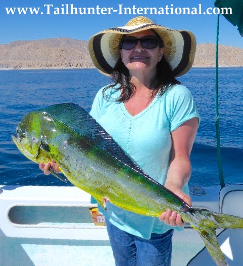 Her first dorado! San Diego in the house with Toni Hayden. She said it was “delicious!” Caught north of La Paz by the island!