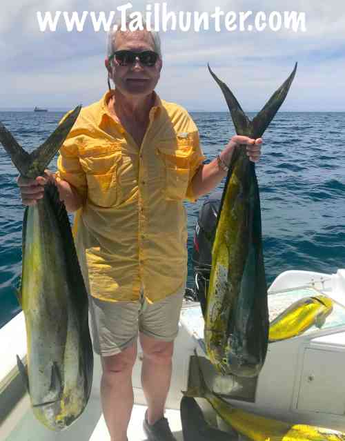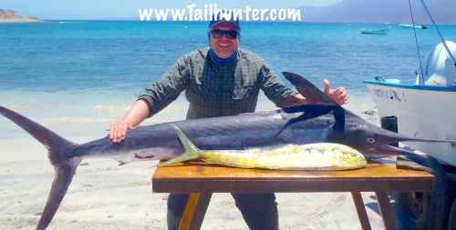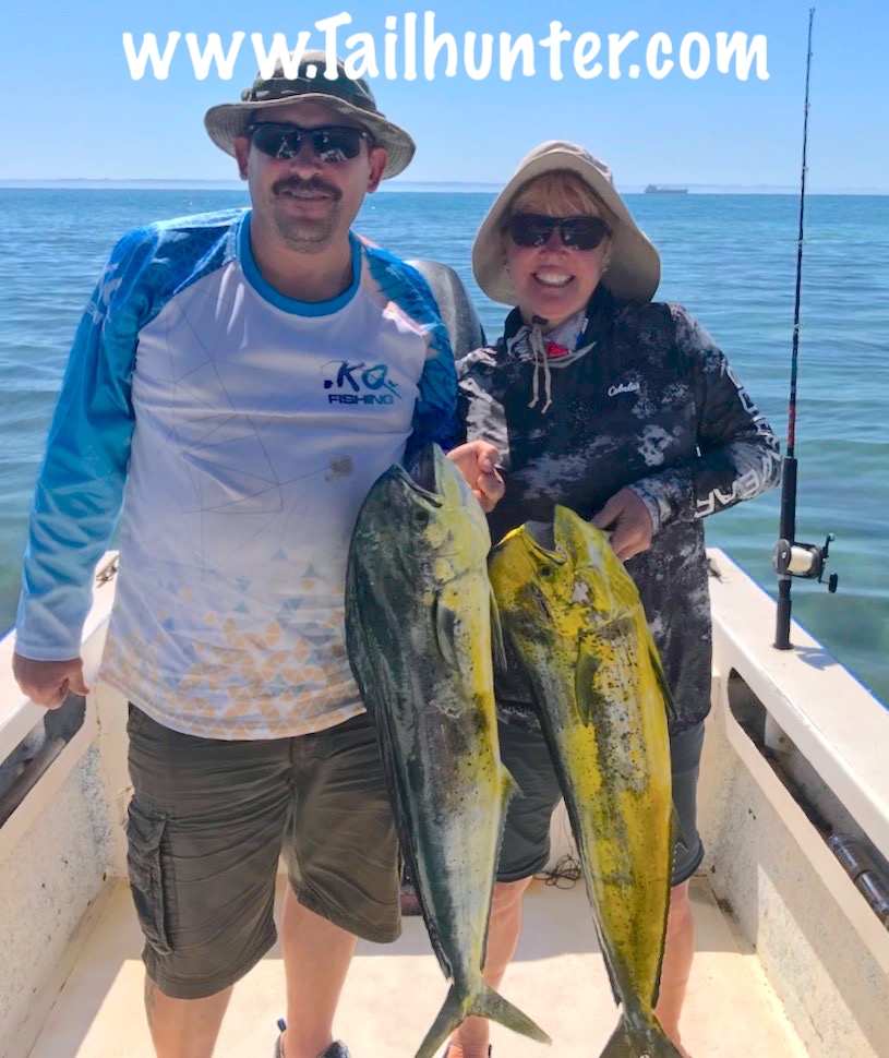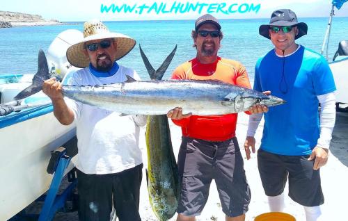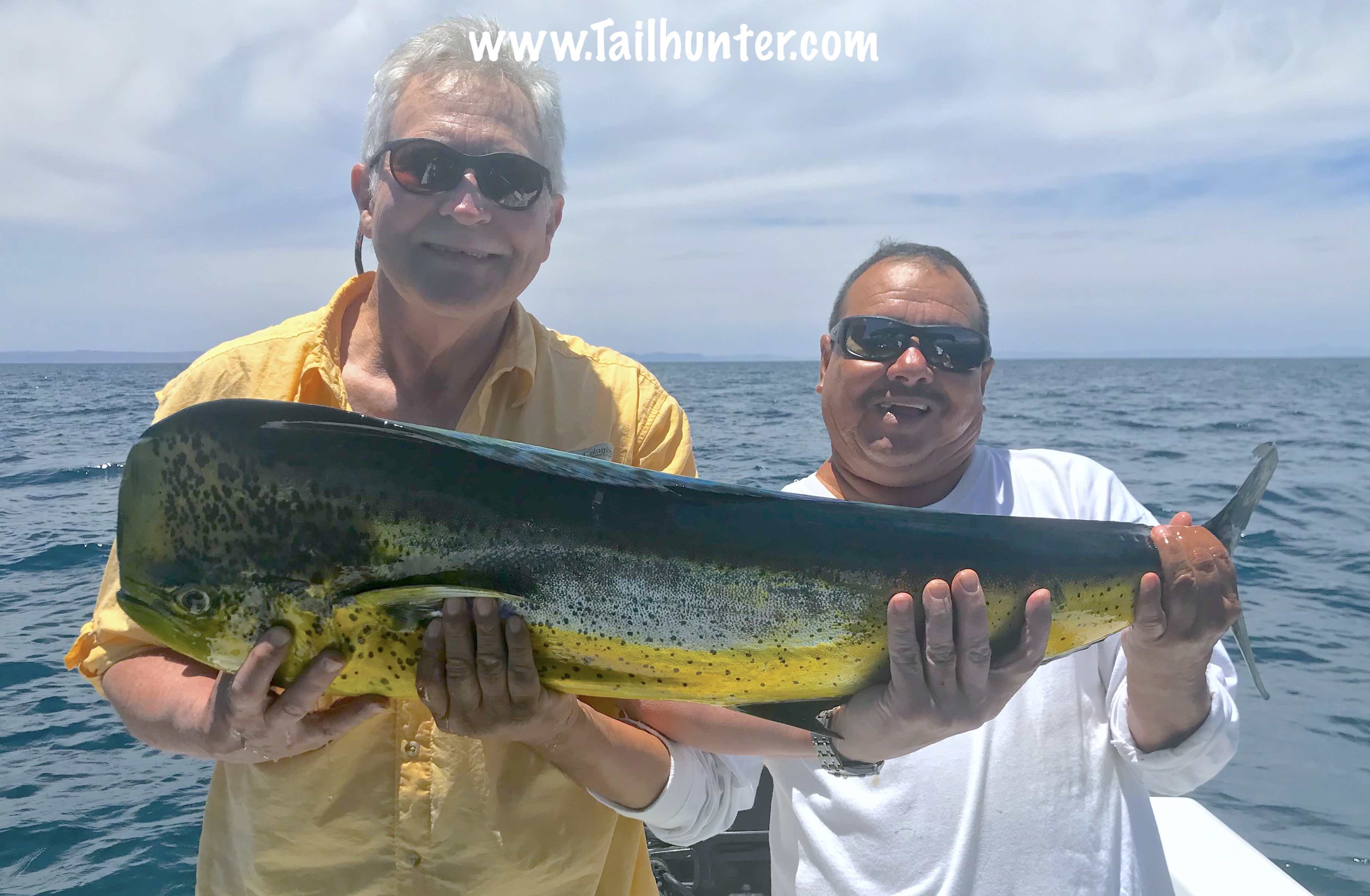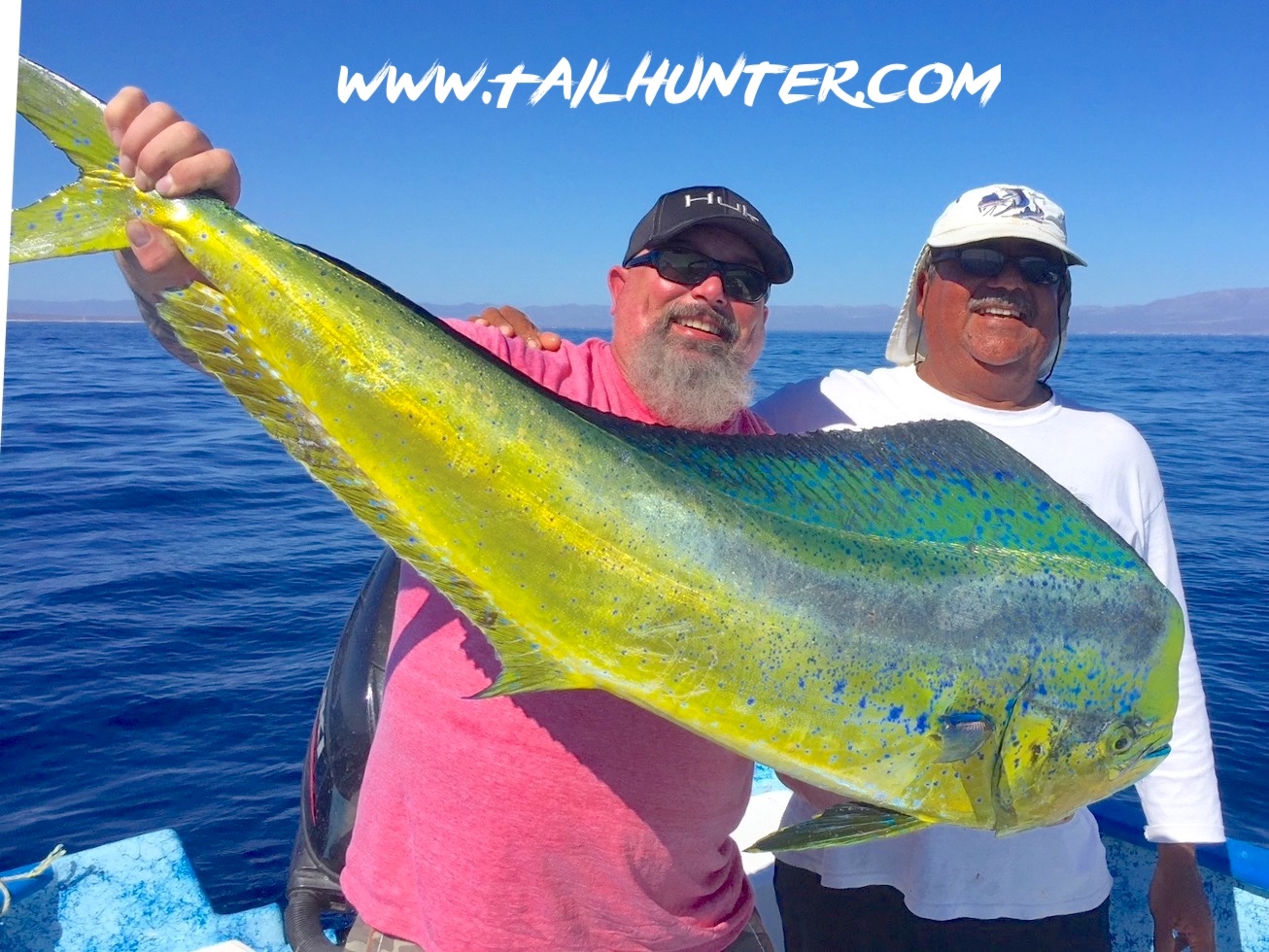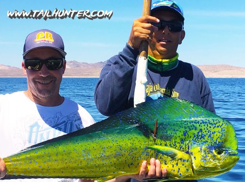 We don’t often have Captain Boli of our Tailunter La Paz fleet, but he’s got a big sonrie going on here with Mike Lohrey from Portland OR and one of several sizeable dorado he caught.