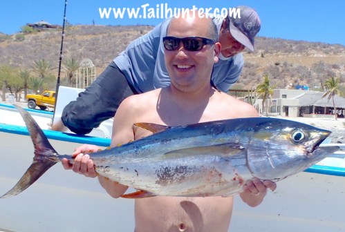 Rob Hoffman lost his first one but finally got his first yellowfin tuna into the panga! He’s from Scottsdale AZ. He has is “best fishing day ever!”