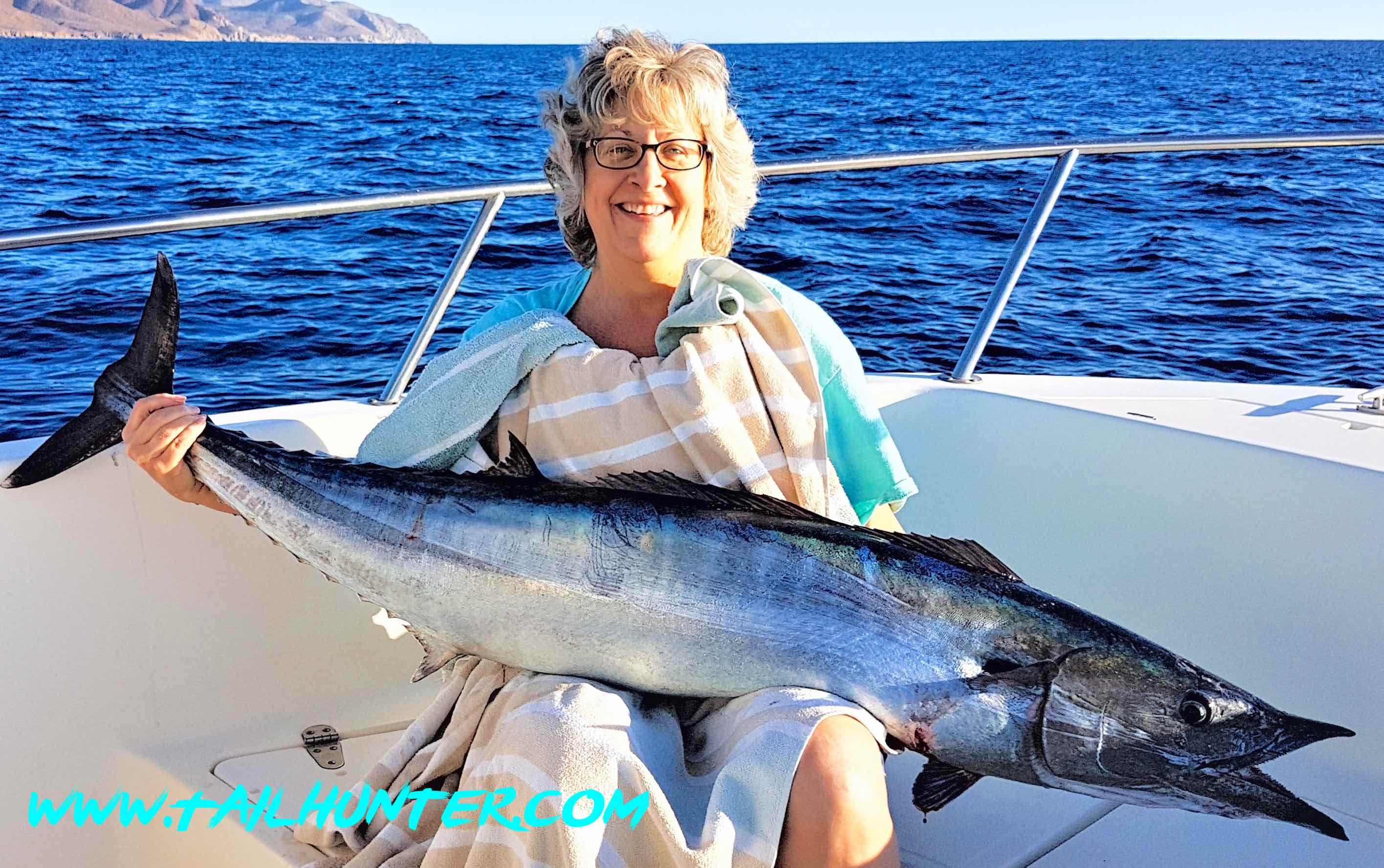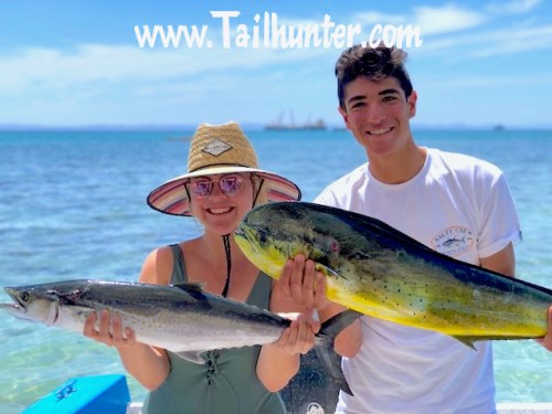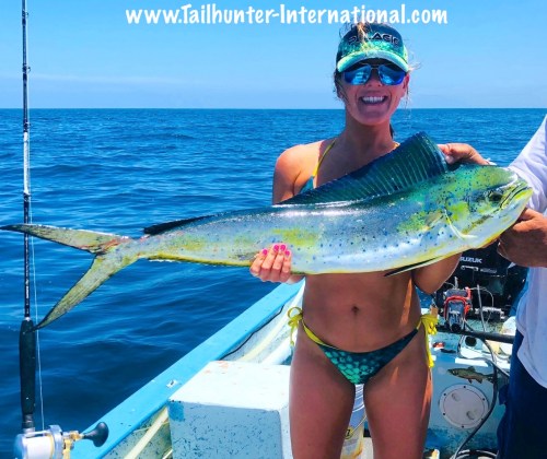 From San Diego, Rebecca Coxsey fished in La Paz for the first time with Tailhunter Sportfishing and got her first dorado and had fun with lots of bonito and pargo as well. She thought it was pretty funny that the dorado matched her bikini. The fish was caught just outside of Bahia de los Muertos.