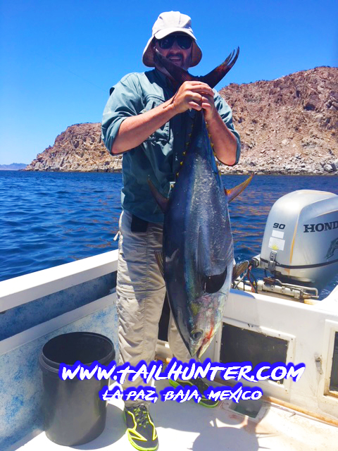 People ask all the time if we have to go out far to catch big fish! Tim Weaver from Arkansas was visiting us for the first time had his hands full wit this estimated 50 pound class tuna he hooked and battled just off the rocks near Espirito Santo Island while fishing in shallow water for cabrilla and pargo,