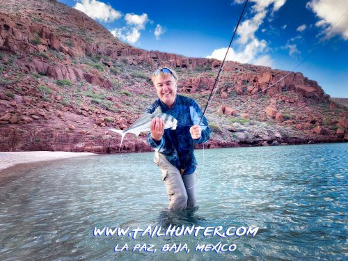 Maybe the prettiest photo of the week. It’s surely my favorite. Taken by Jae Shin of John Daley and a flyfishing catch of a little roosterfish from the shore (released). John and Jae are from Anchorage, Alaska.