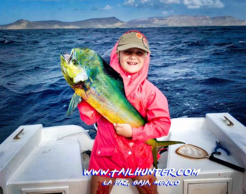 You gotta love Paige Resky! She’s 8 years old and in rough seas outside La Paz Bay, in her rain slickers with blood on her legs, she’s a gamer and holding onto her dorado! Nicely done, young lady!