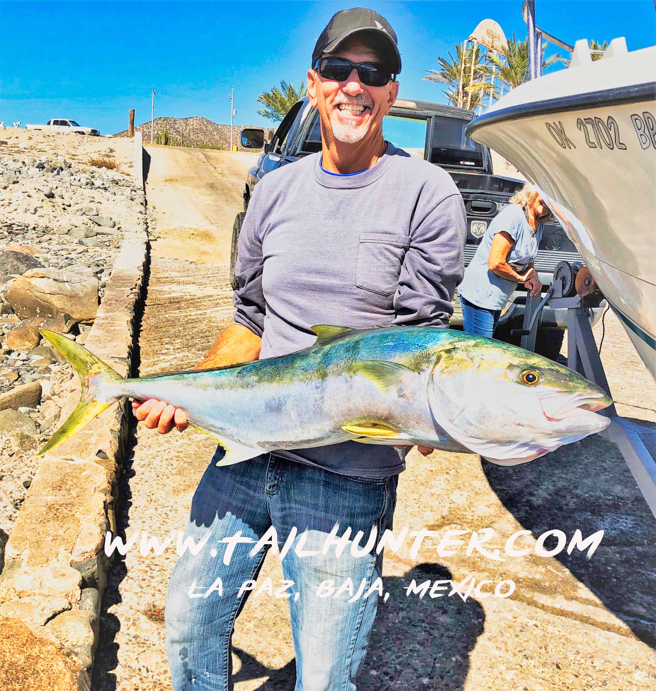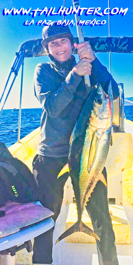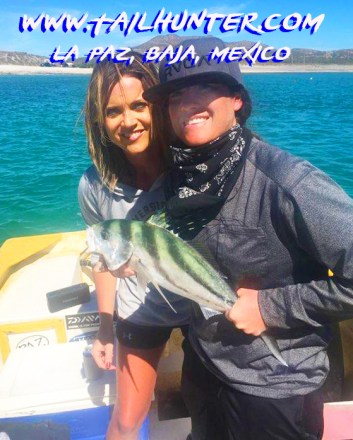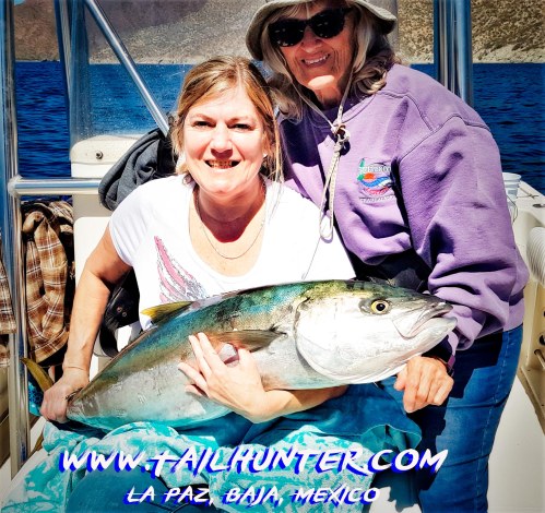 Debbie Walden from Lakewood CA was out visiting her sister Donna Thompson (right) this past week near La Paz. Donna has lots of experience on big Baja fish and they were out at the north end of Cerralvo Island when they hit breaking yellowtail. This guy hit and both ladies had fun tag-teaming to get it to the boat.