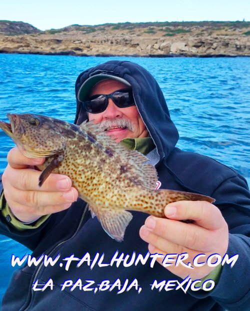 It looks a little chilly! Is this Baja? Just off the rocks at Punta Perico, Dick Gasser got this little cabrilla and released it.