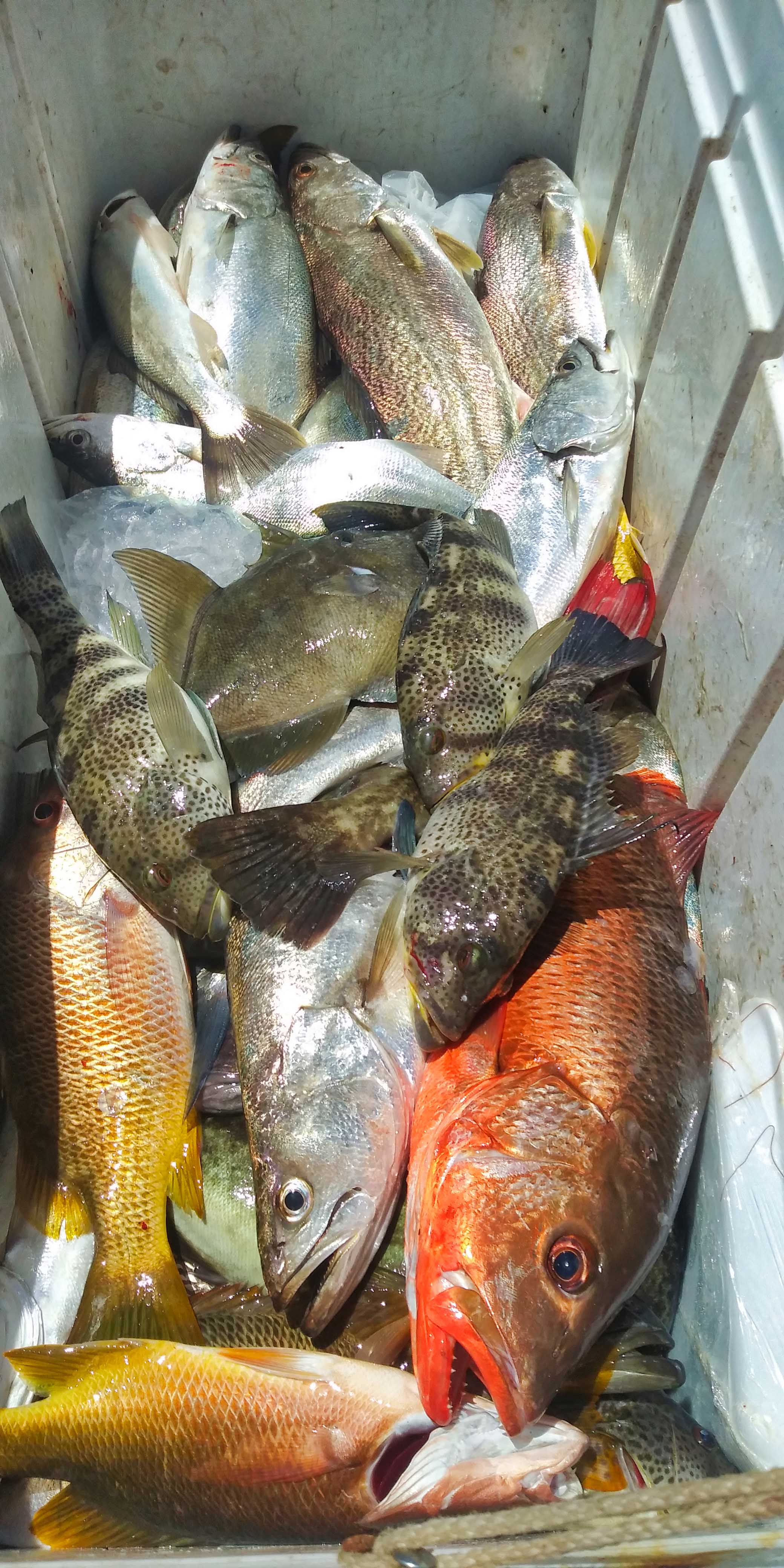One a single day, they estimated they hooked more than 50 fish releasing most and donating others and, of course, keeping some for dinner. Here’s a layer of fish sitting on a bed of ice in the ice chest with about a 1/2 dozen different species.