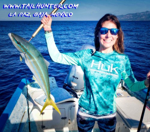 Celebrating her honeymoon, Coral Ogden Hart has been our amigo since she was a little girl. She got this unusual rainbow runner off Bahia Muertos. These are cousin to the yellowtail.