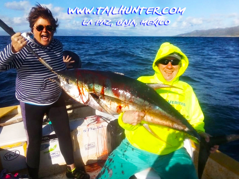 Just a great photo! They got blown off the first day but hung in there and went out despite waves and strong winds (check out Jan’s hair and Art’s hoodie). However, first-timer Jan Paisley and Art Flippin from Colorado went out dragging a Rapala hoping something would bite and this big 70-pound yellowfin tuna chomped the line! They were just off Punta Arenas with Cerralvo Island in the background. Surprise catch for this time of year!