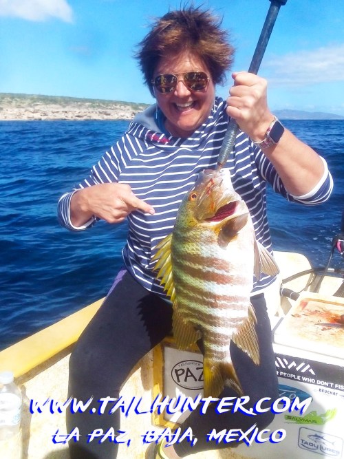 That’s a tasty barred pargo for first-timer, Jan Paisley from Colorado with a big smile!