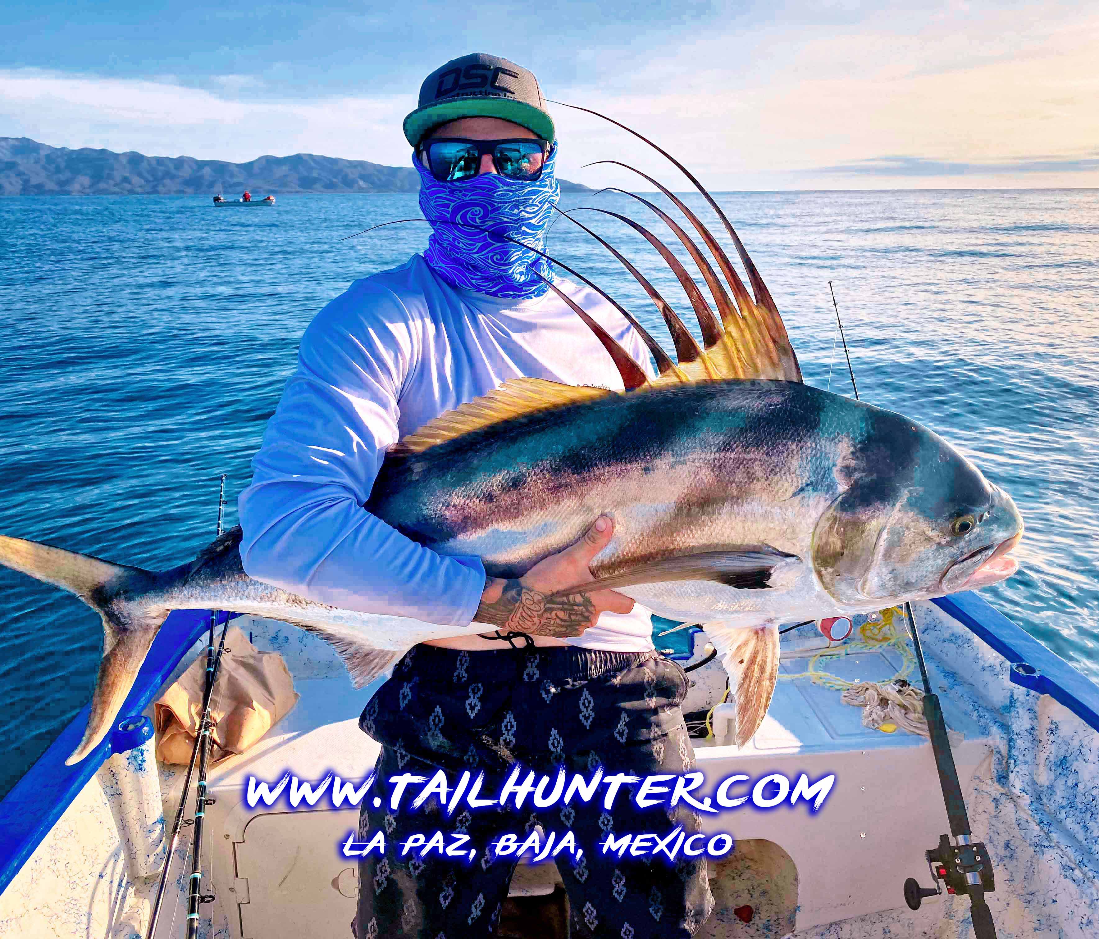 The masked fisherman is Austin Dorati with a fat roosterfish to start the day. The fish was released.