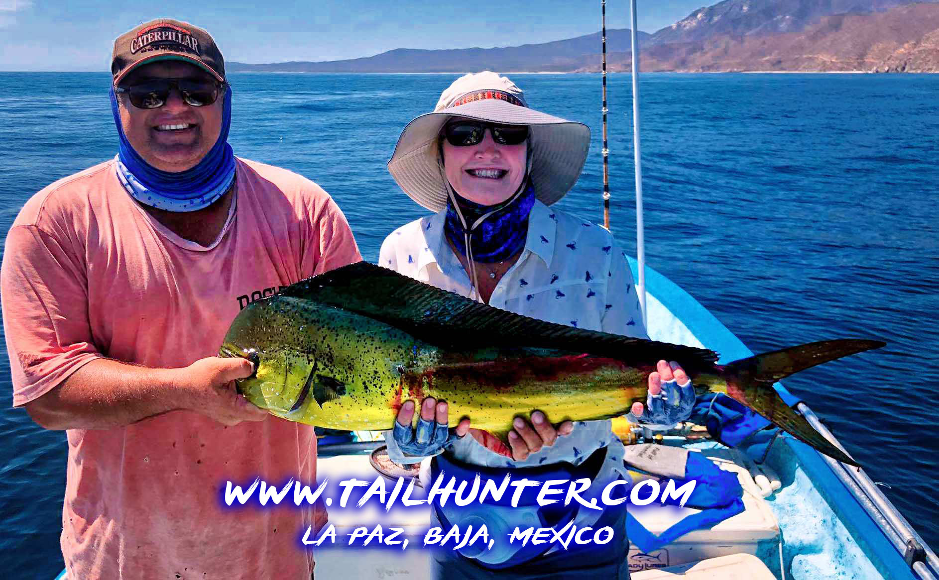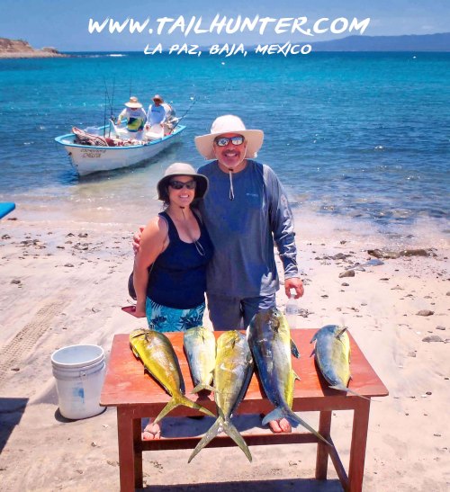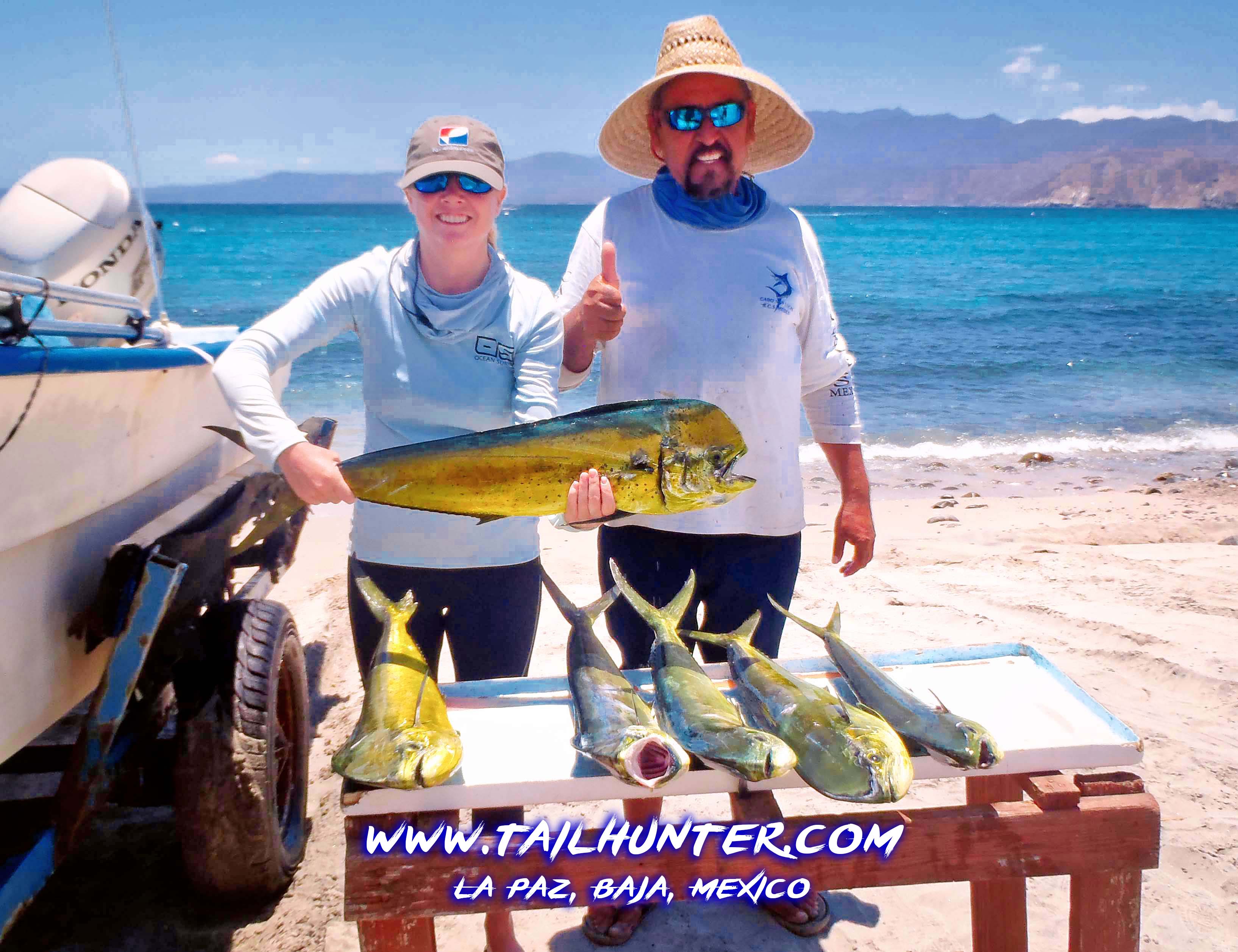 Elena Galvan and Steve Ortega visited us for the first time and put some dorado into the box. Standing on the beach at Bahia Muertos.