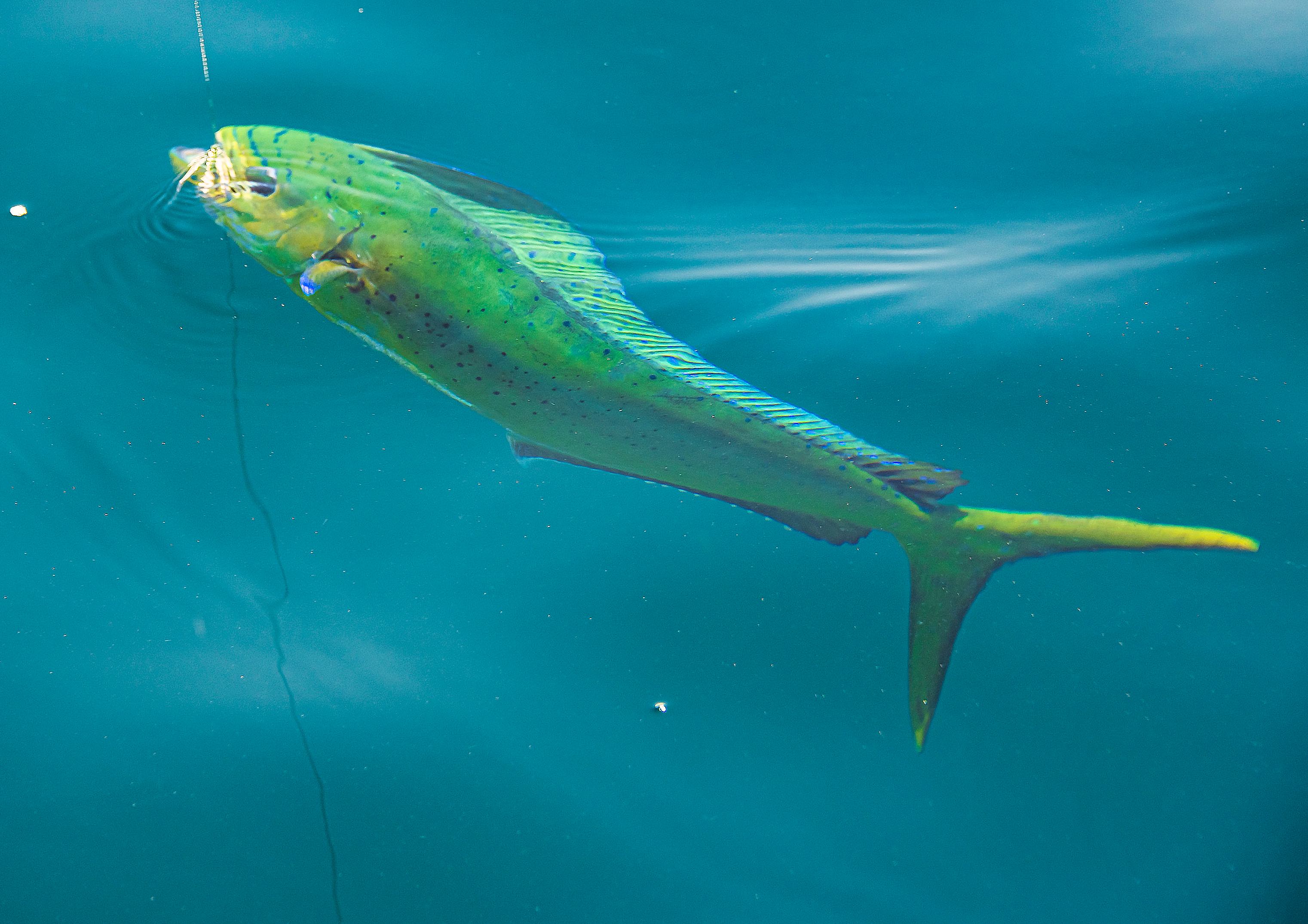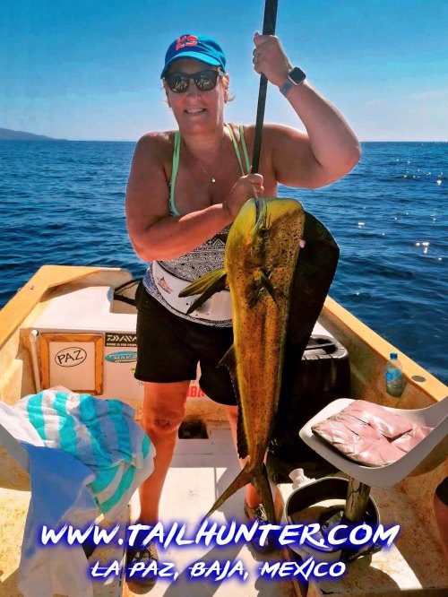 Sue Slaugh has been with us for many years from Salt Lake City and has herself a dorado on the gaff headed for the grill!