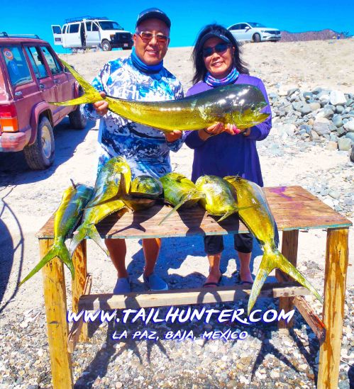 Our friends from Henderson NV, Gary and Lois Tsunoda had a great week on dorado and pose for one-day’s catch on the beach at Bahia Muertos. The fish were definitely larger this week.