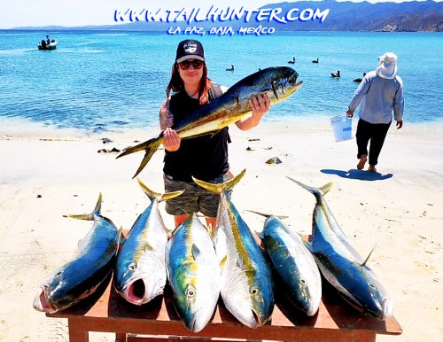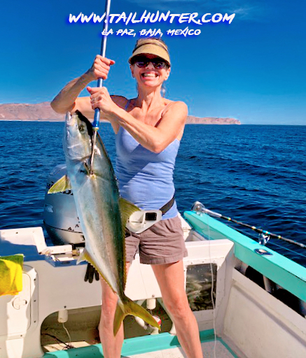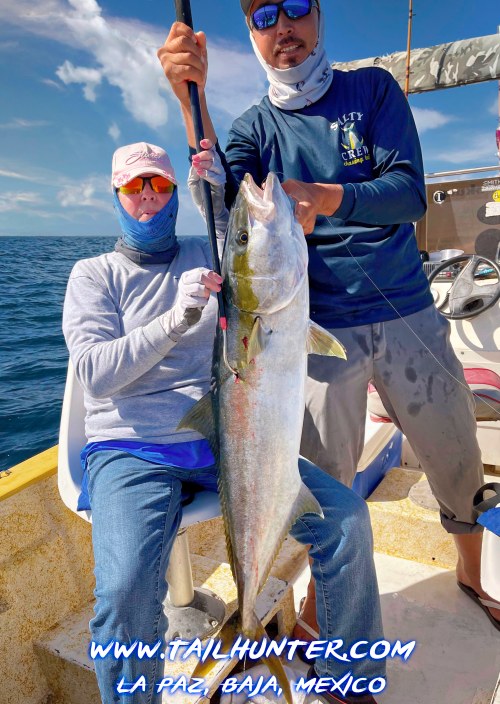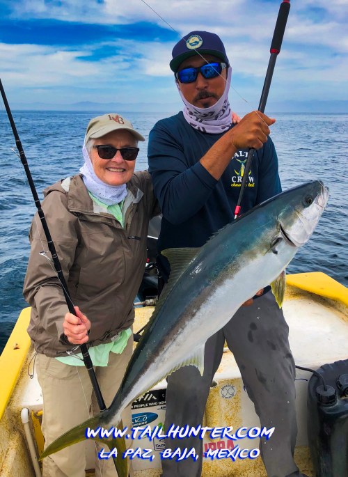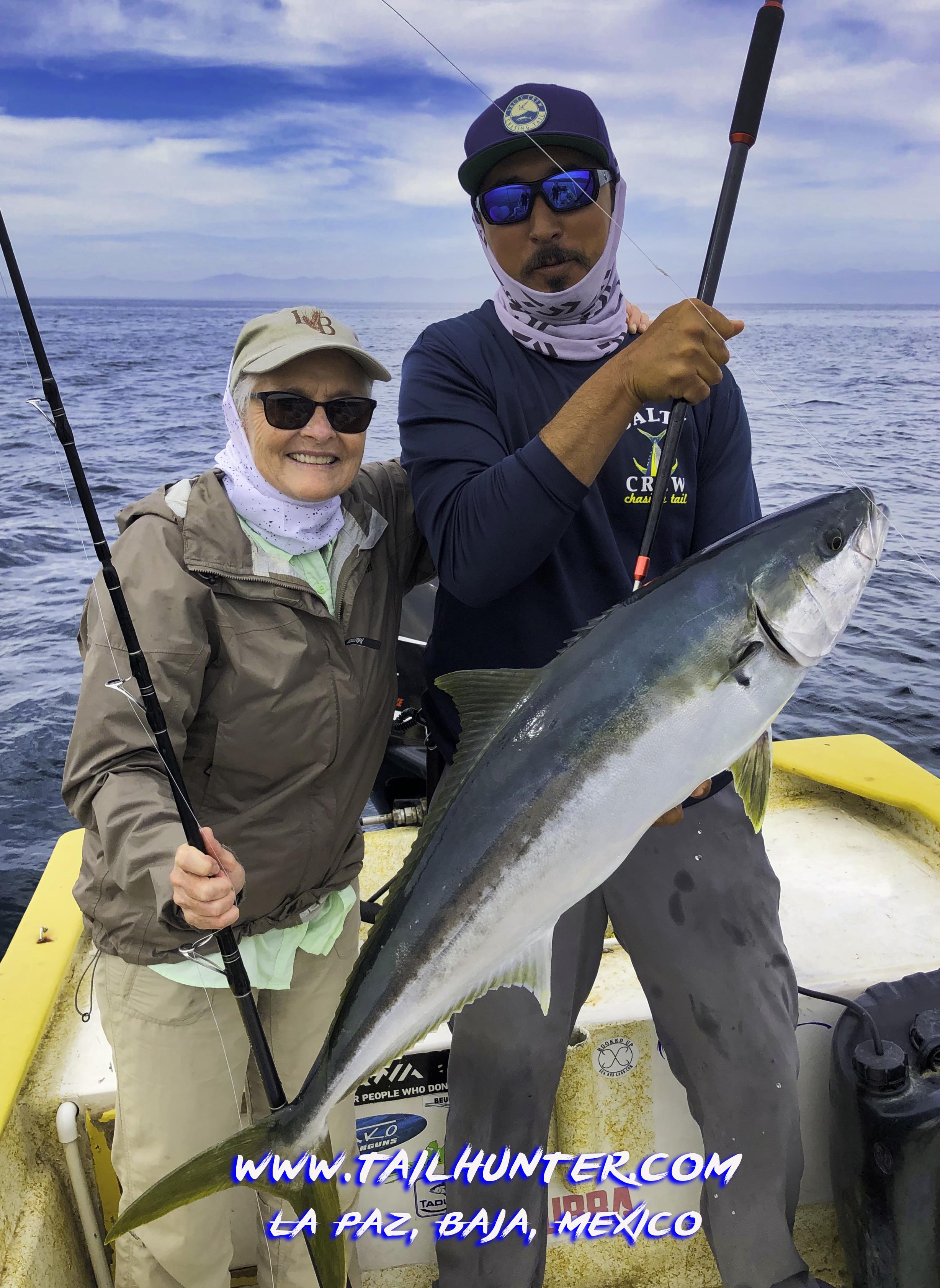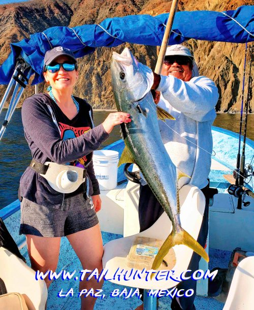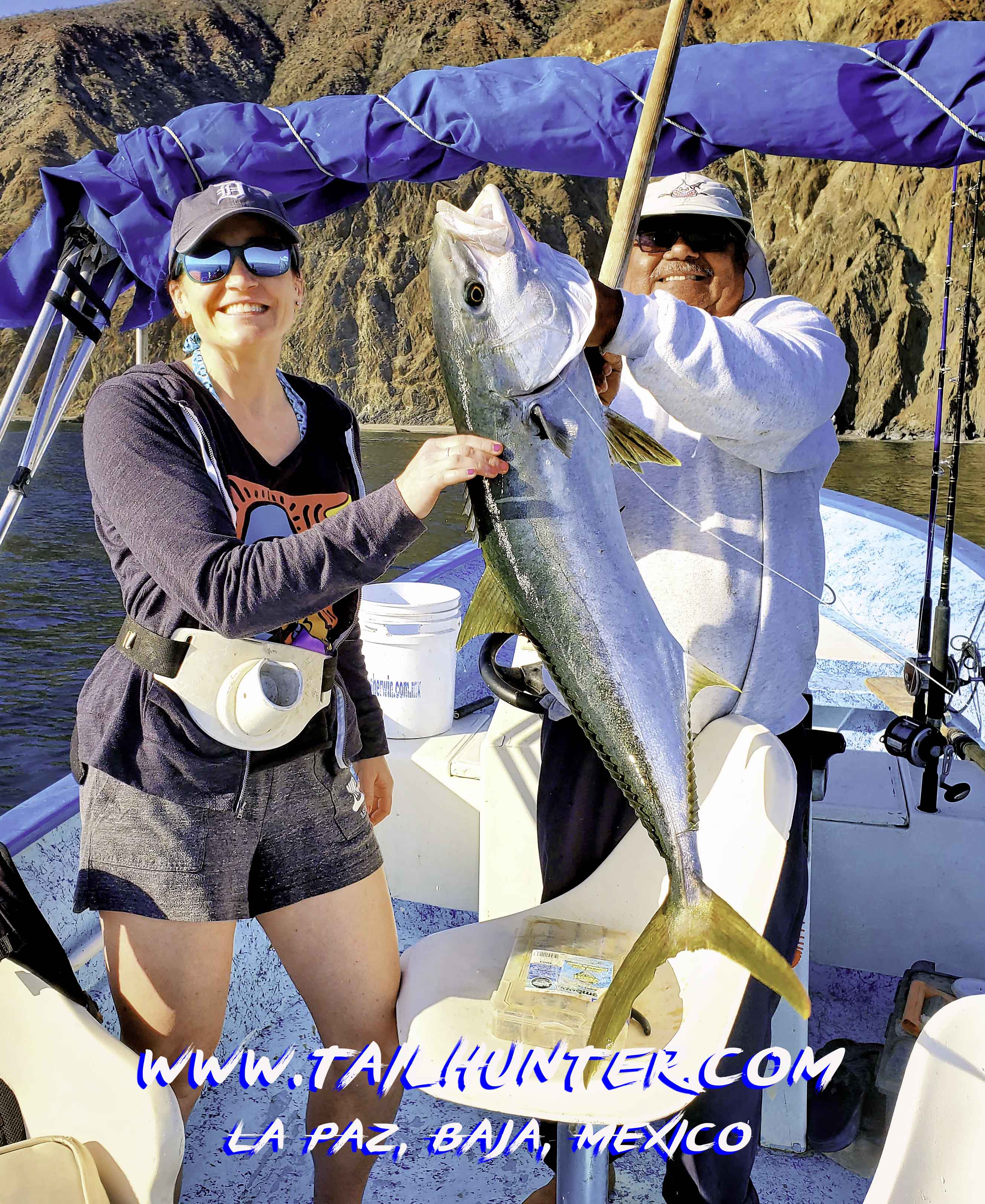 Alla Cazier is all smiles with her thick yellowtail she hung north of La Paz near Espirito Santo Island. Alla came to visit us from San Antonio, Texas.