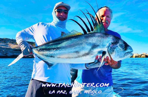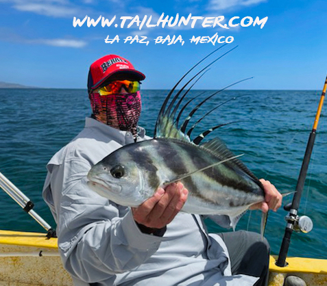 Johnny Enright from Lemon Grove CA shows off our first roosterfish of the season taken on a live bait near Bahia Muertos. The fish was released. Schools of roosters are now showing up in the shallows.