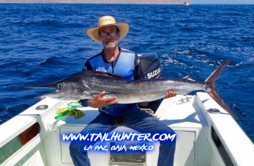 Patrick Busby from Louisiana battled this striped marlin on 20 pound test and a light 8-foot spinning outfit for an hour-and-a-half. He was fishing with the Tailhunter Fleet in La Paz. They were fishing light tackle in a school of dorado when the marlin bit.