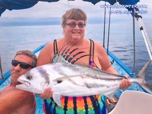 Happy gal, Angie Bennett had some fun catching and releasing roosterfish on her one day fishing with our Las Arenas fleet. Husband, Jay, does the photo-bomb. They are our amigos from Waco TX.