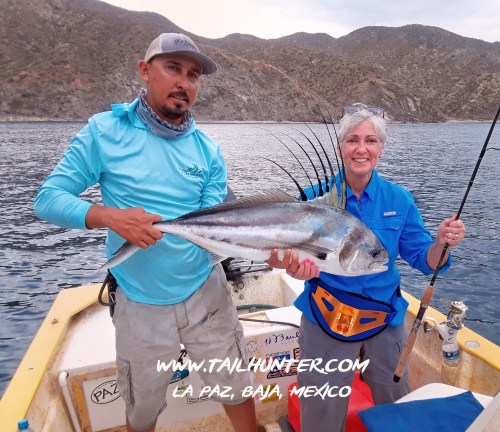 With her favorite Captain Pancho, Diane Kunze has alot of fun with her light spinning rod. She had a few days bending that rod on roosters like this. All fish released. Diane is our sweet amiga from Colorado for many many years.