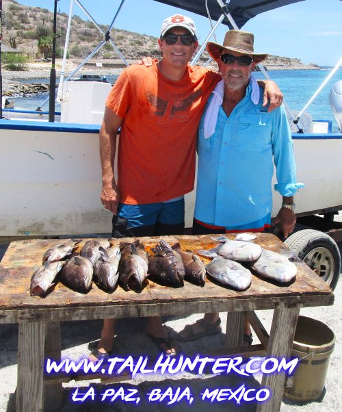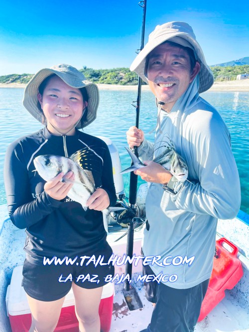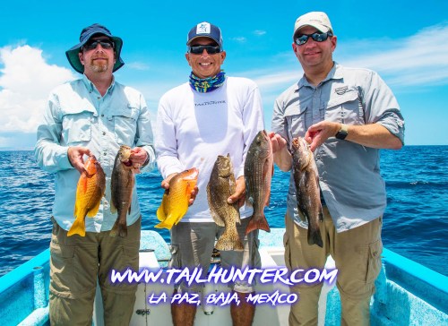 It’s like fishing in an aquarium if you go for the reefs and rocks holding snapper, cabrilla, pargo and others. All great eating. Captain Joel in the middle with Jeffrey and Miles Brown from Oregon who hit the rocks with light tackle north of La Paz.