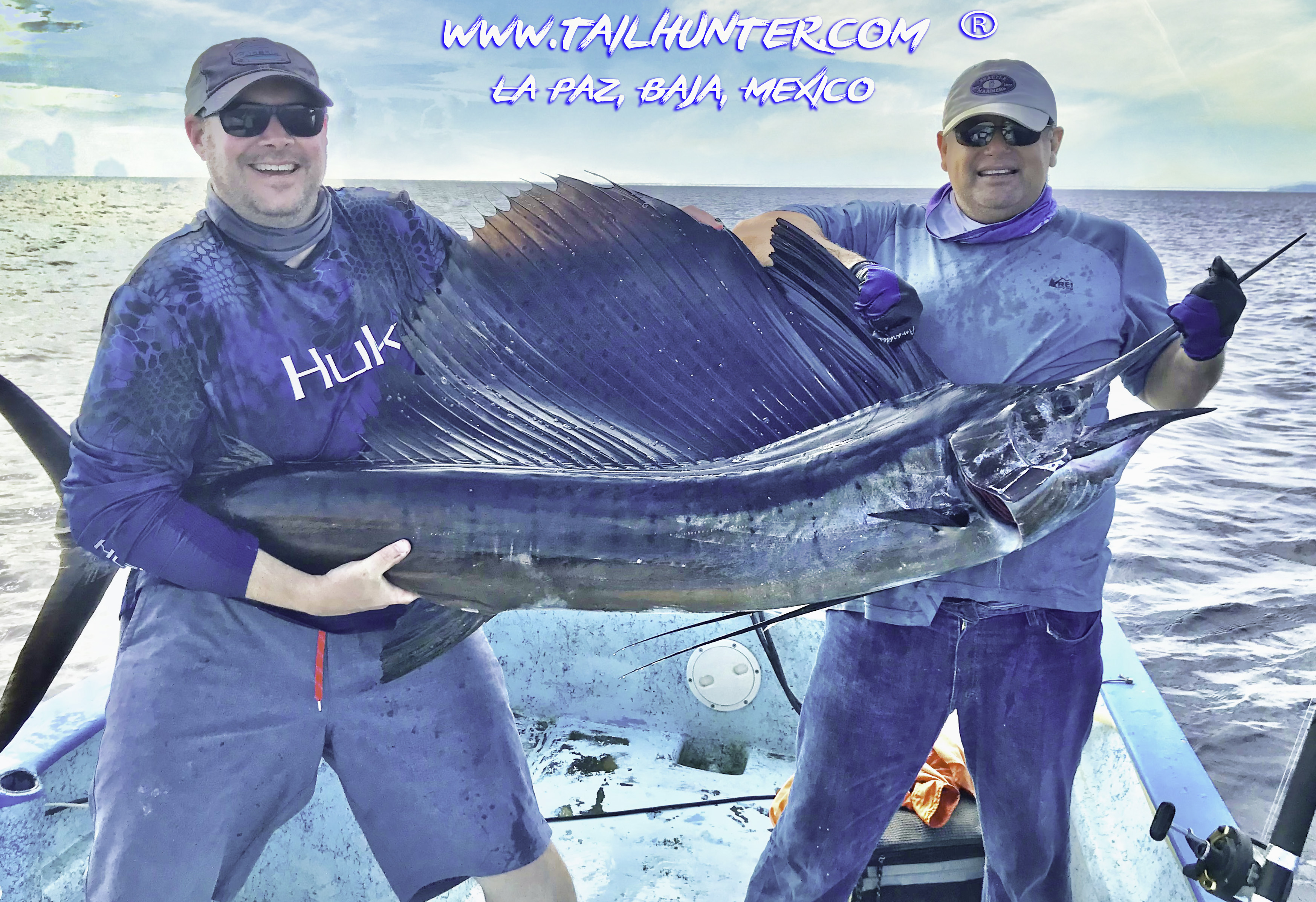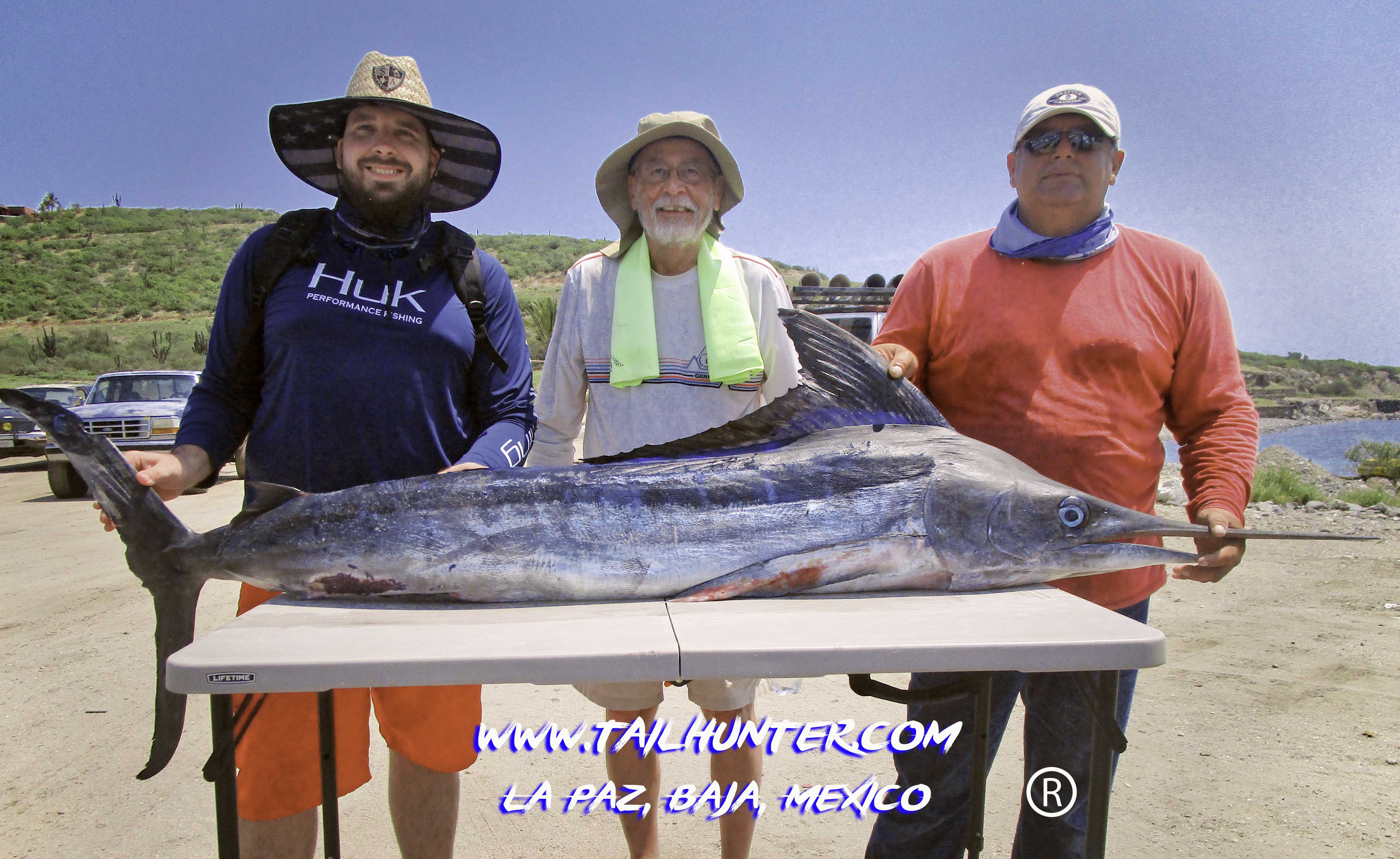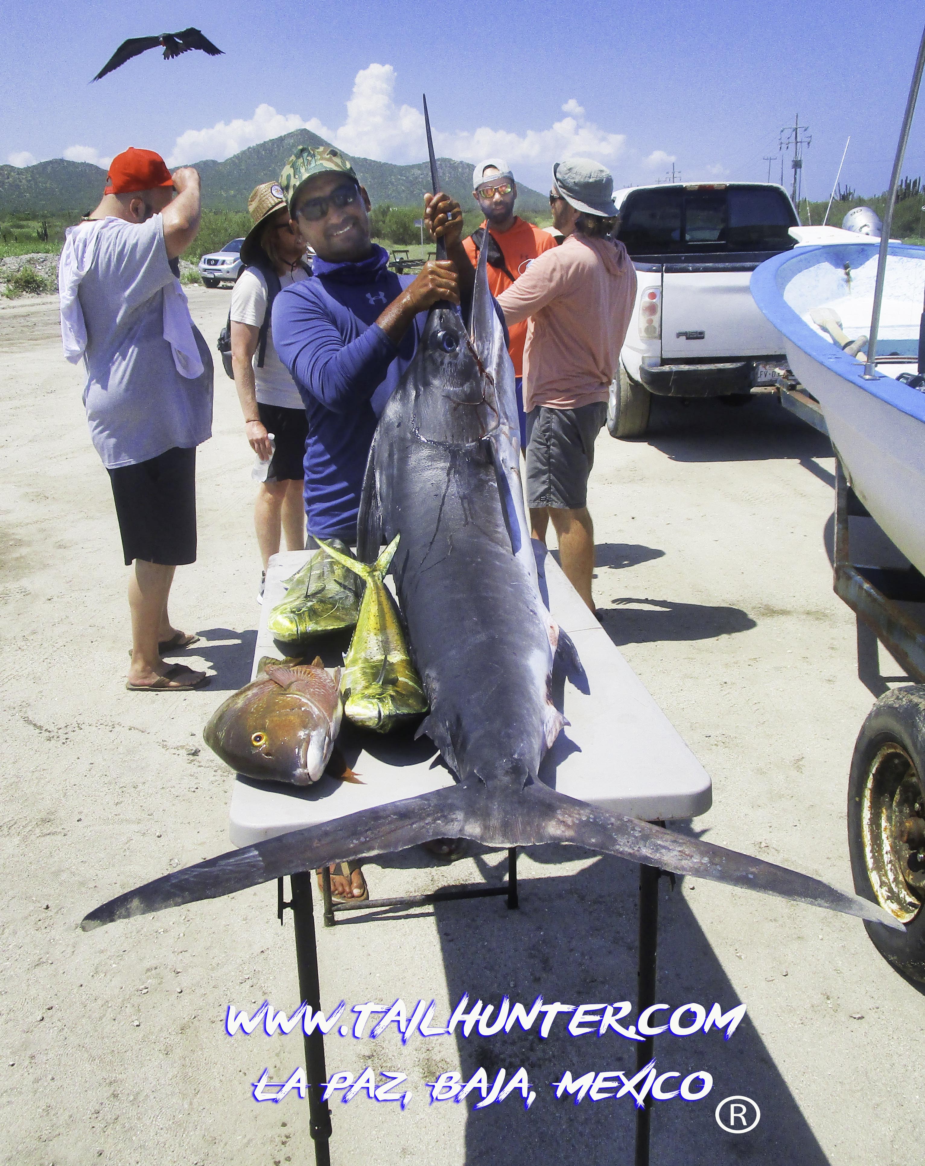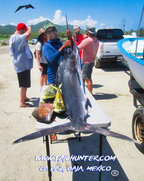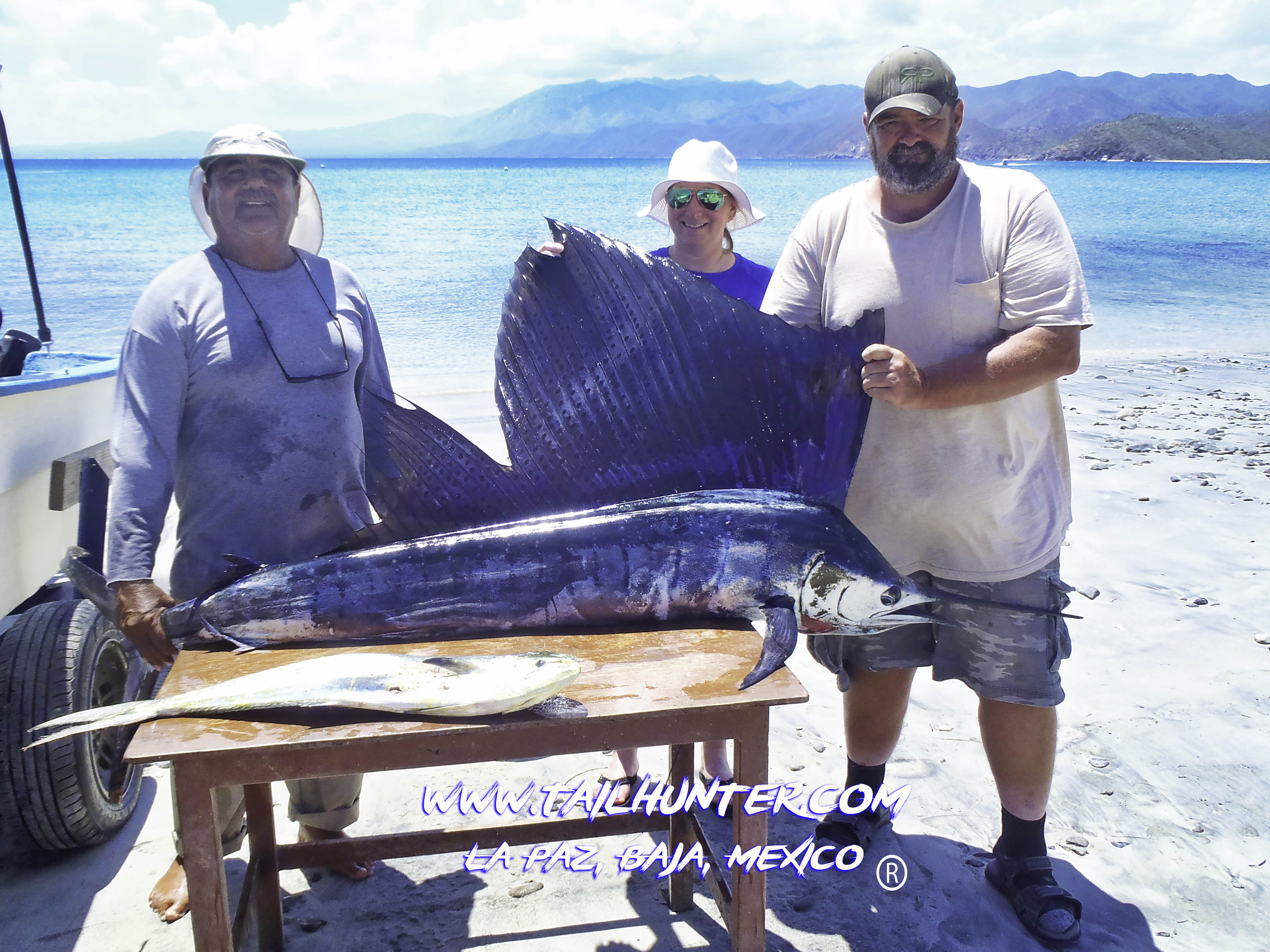 Captain Victor and Jermey and Deanna Page with a big sailfish he caught as well as a dorado. The Page’s came to see us from Oregon and it was their first time in La Paz.