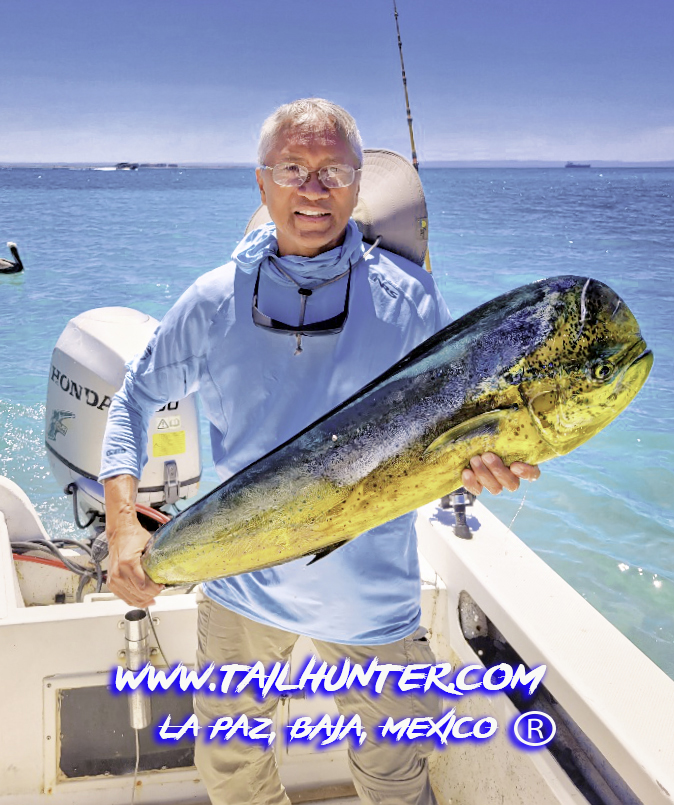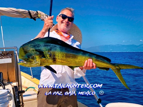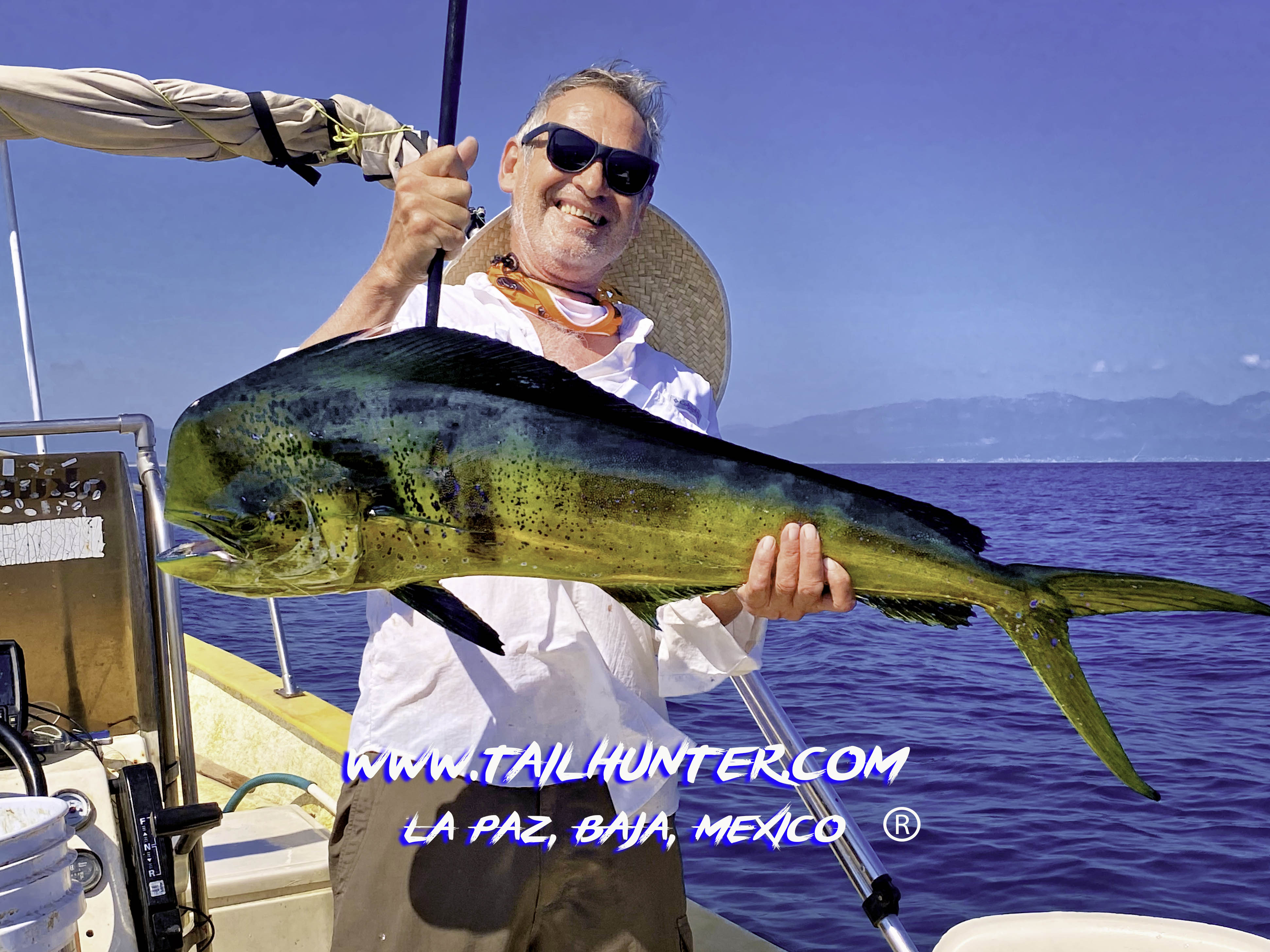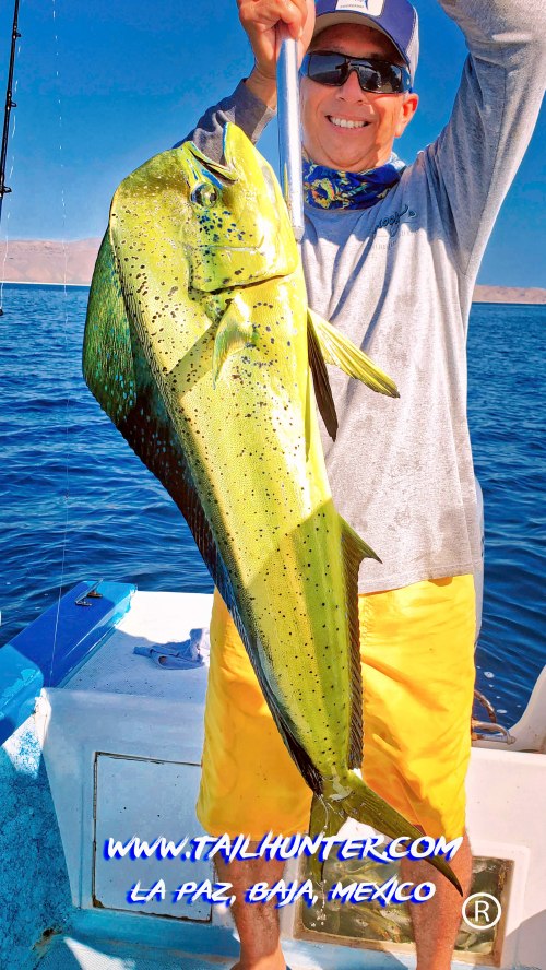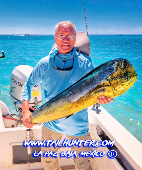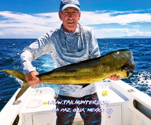 Jim Bovee from San Diego loves his dorado fishing. On his 3rd visit this year had had some great days in the mahi schools. Sizeable bull here caught north of La Paz.