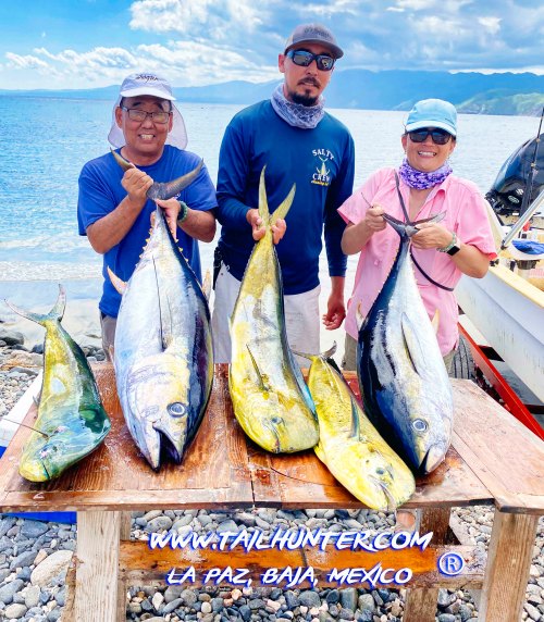Crazy tuna! We’ve literally caught almost zero tuna this year, but Tak and Marlene Kikuchi from Los Angeles were with Captain Pancho trolling Rapalas trying to catch a bonito for bait (since there was no live bait that day) in the shallows in front of Boca de Alamo when they got slammed by these two 40-pound class yellowfin. Pretty good on the dorado as well!