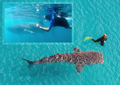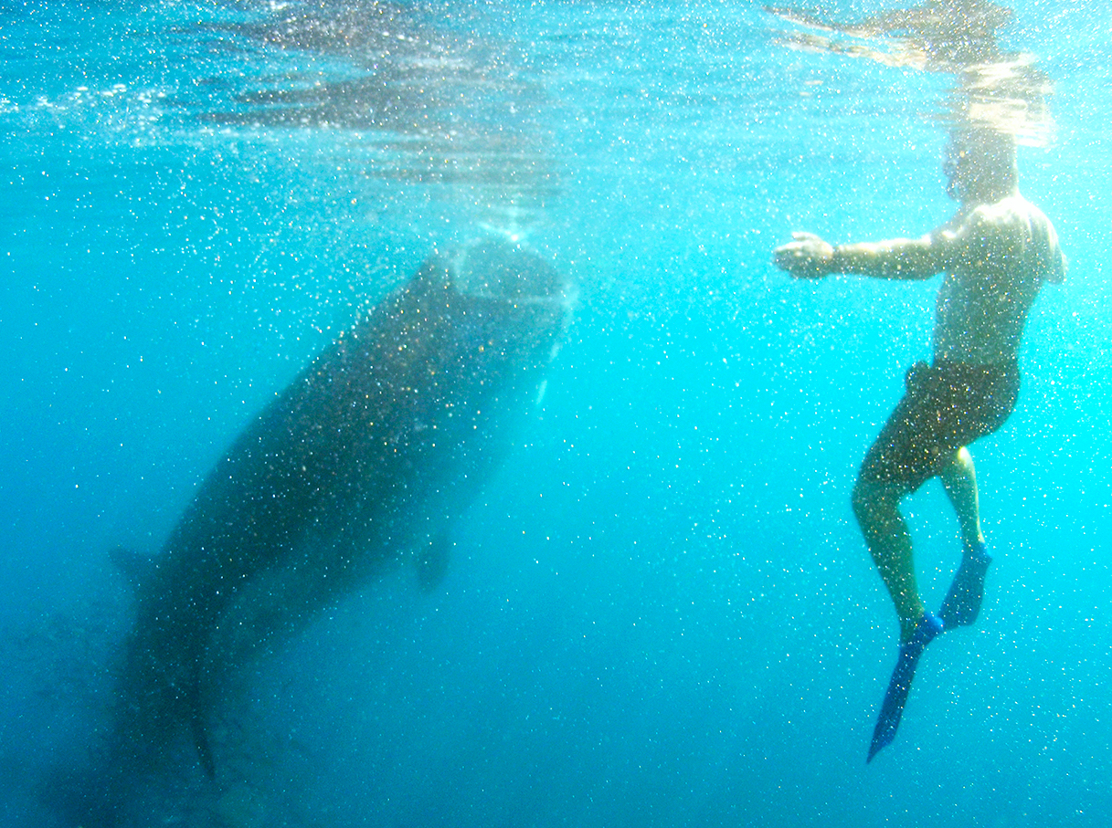 This past week, there were anywhere from 5 to over a dozen of these “baby” whalesharks up to about 15′ long. The problem, at times is that too many folks want to get in the water with too few animals. Only 5 persons are allowed in the water per whaleshark so as not to intrude too much on the animals while they feed on plankton.