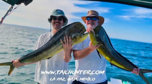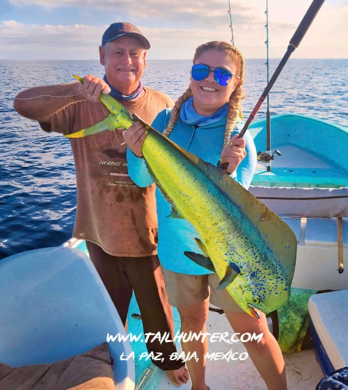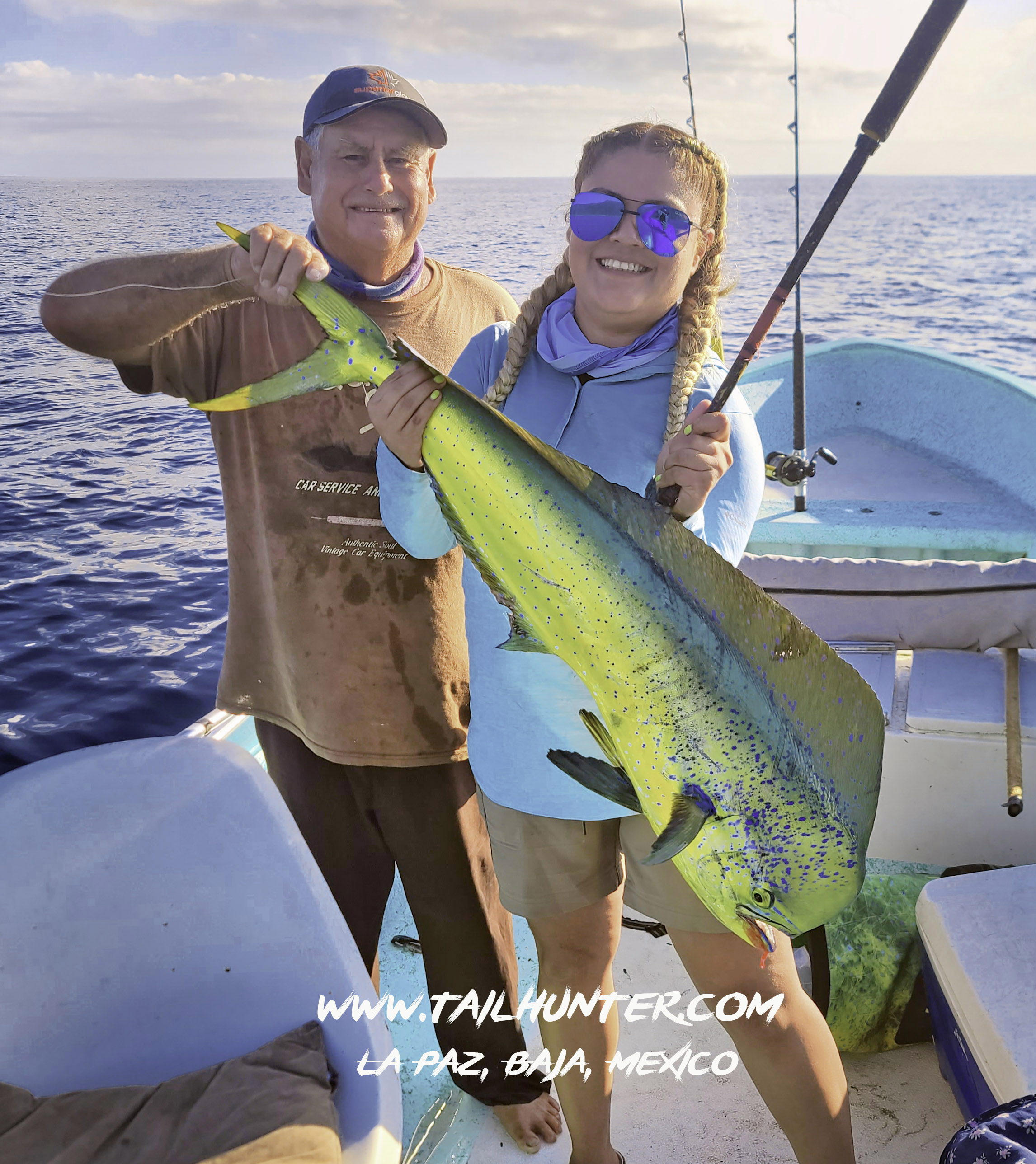 Great shot of first-timer Hysby Rodriguez from Glendale CA with a smiling Captain Arcangel and another of her dorado for the fish box.