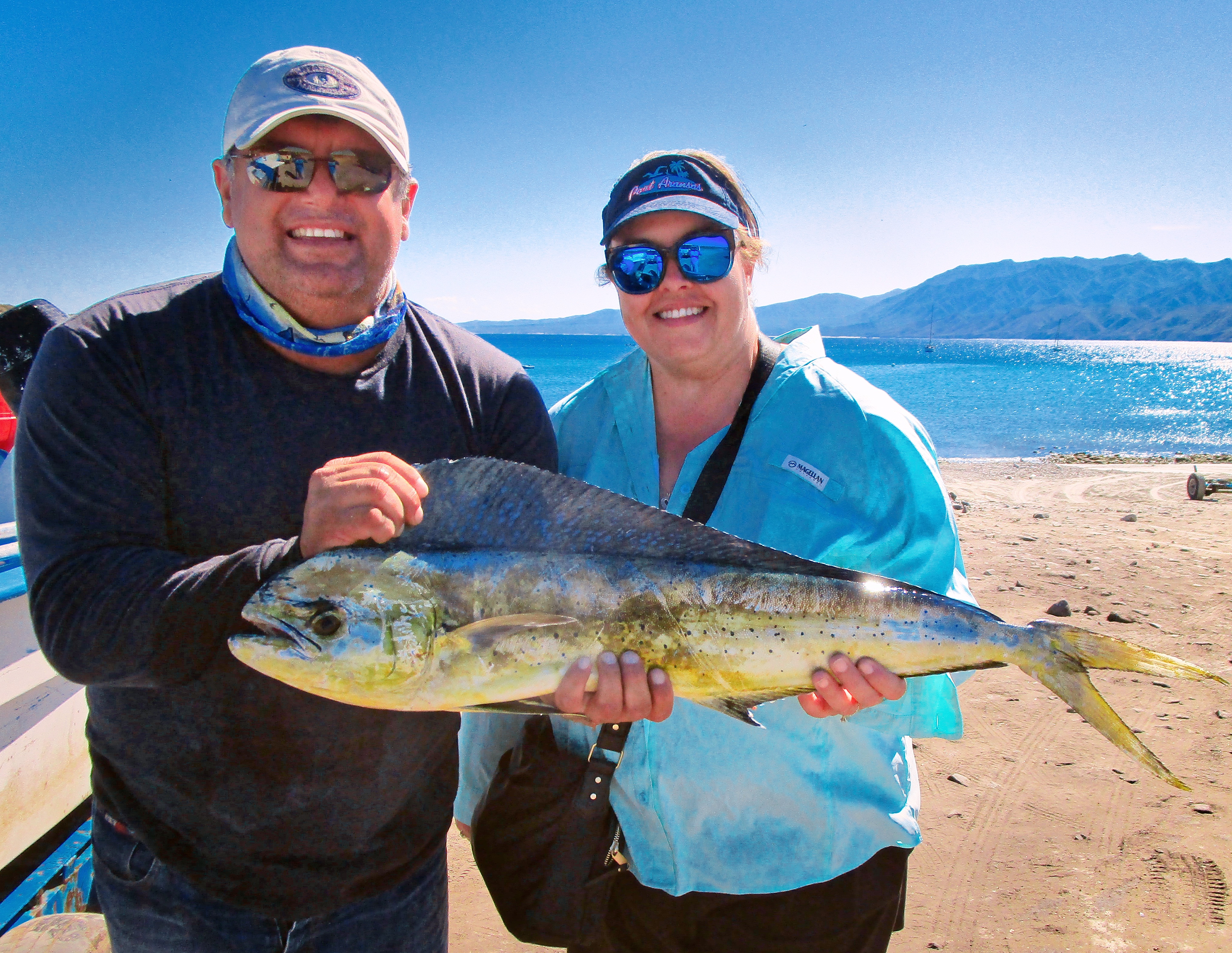 Tracy Patek and Captain Armando have a dorado and some nice smiles on the beach!
