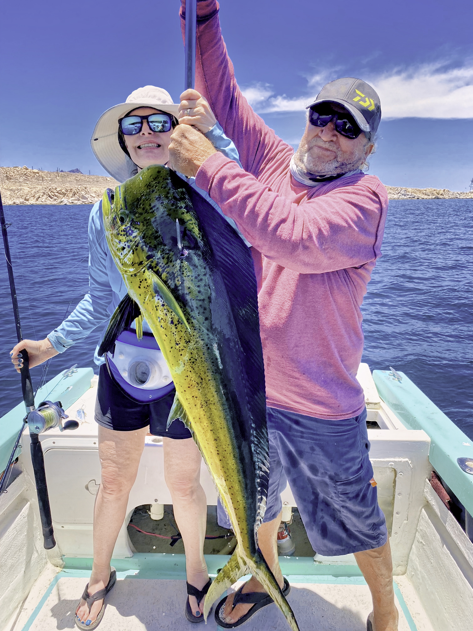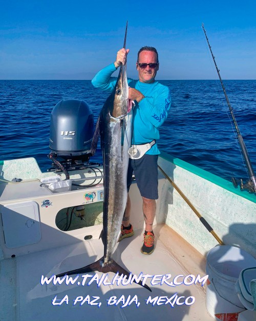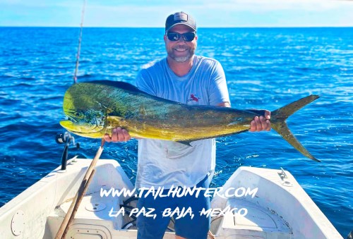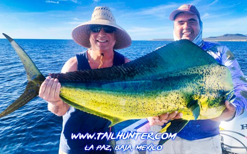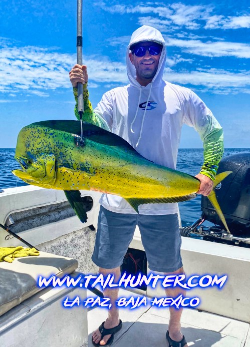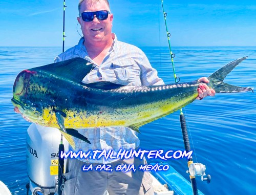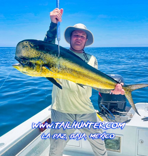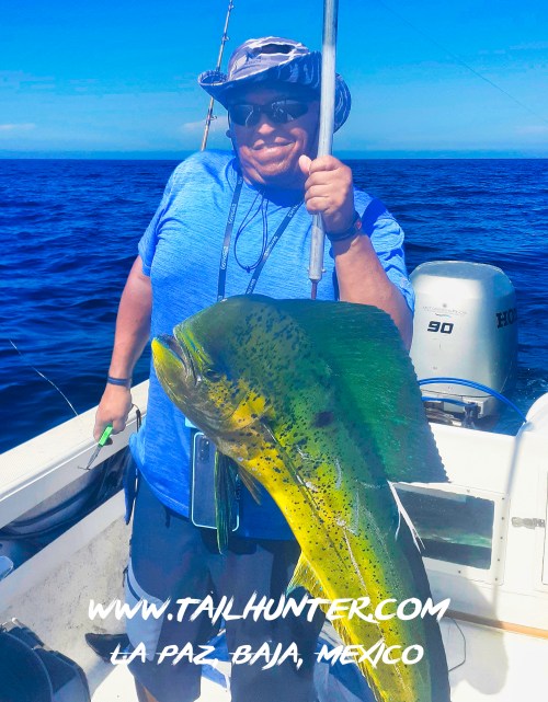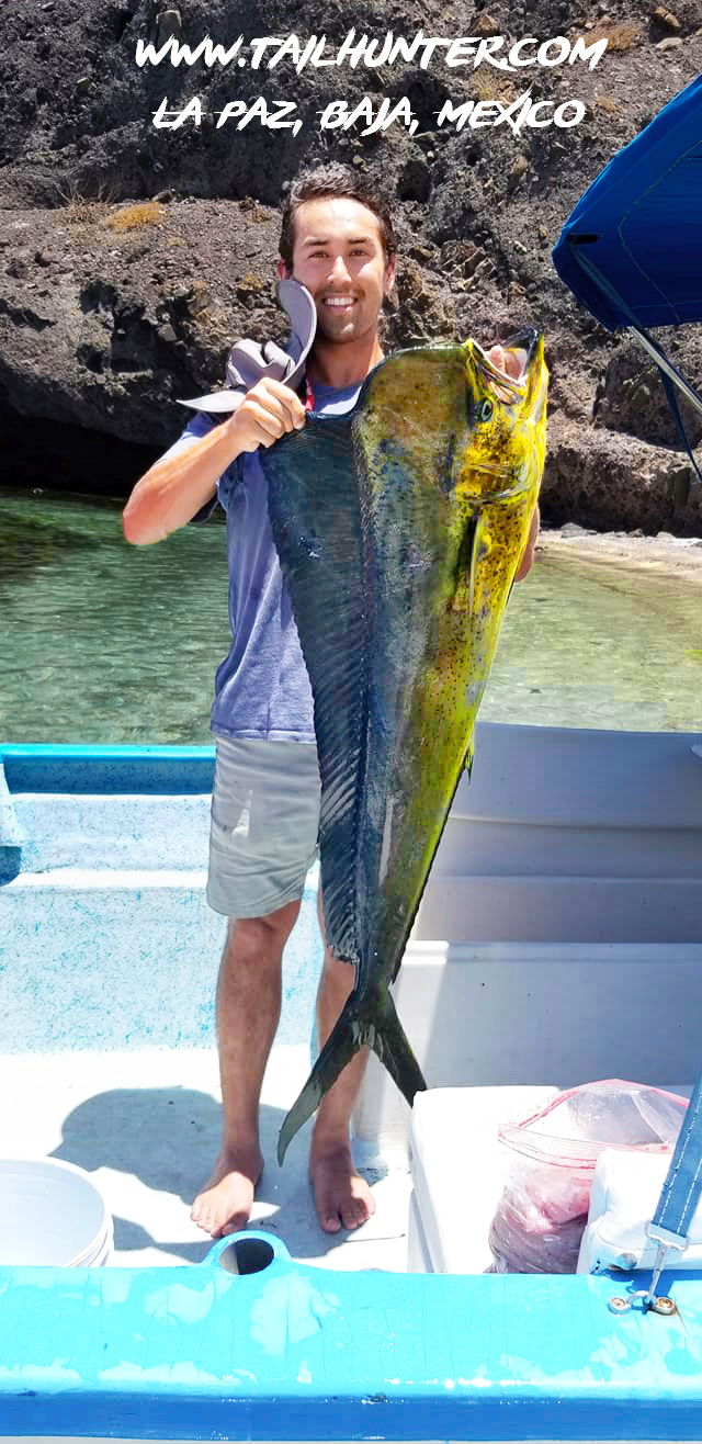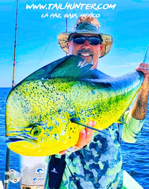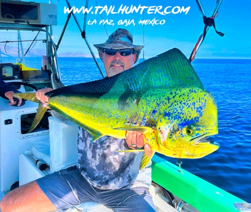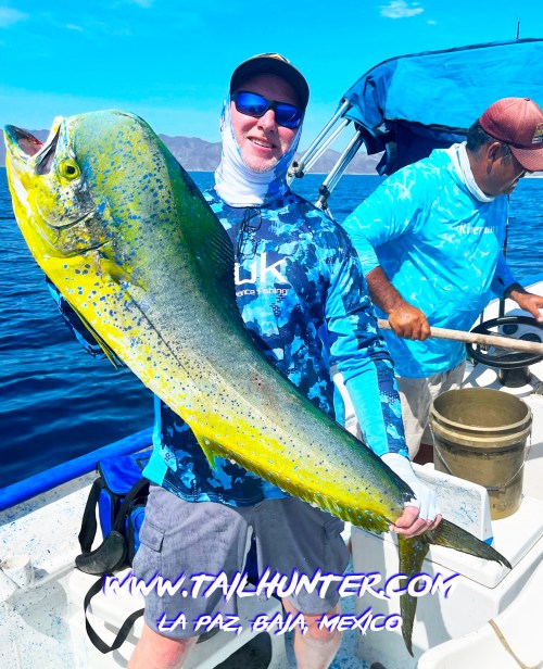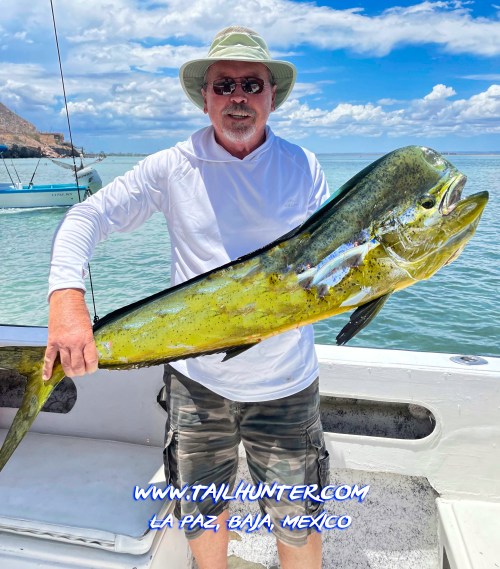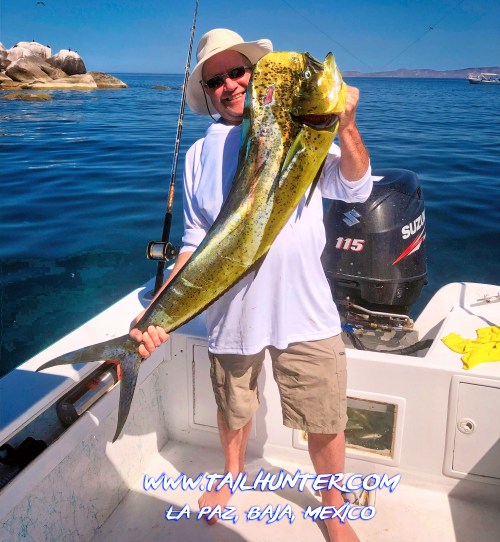 Wow! When Captain Victor thinks you have a “50 pounds fish” that’s alot of credibility . Greg Hall on his first trip to see us from Portland OR with a beast bull dorado. Cerralvo Island in the background.
