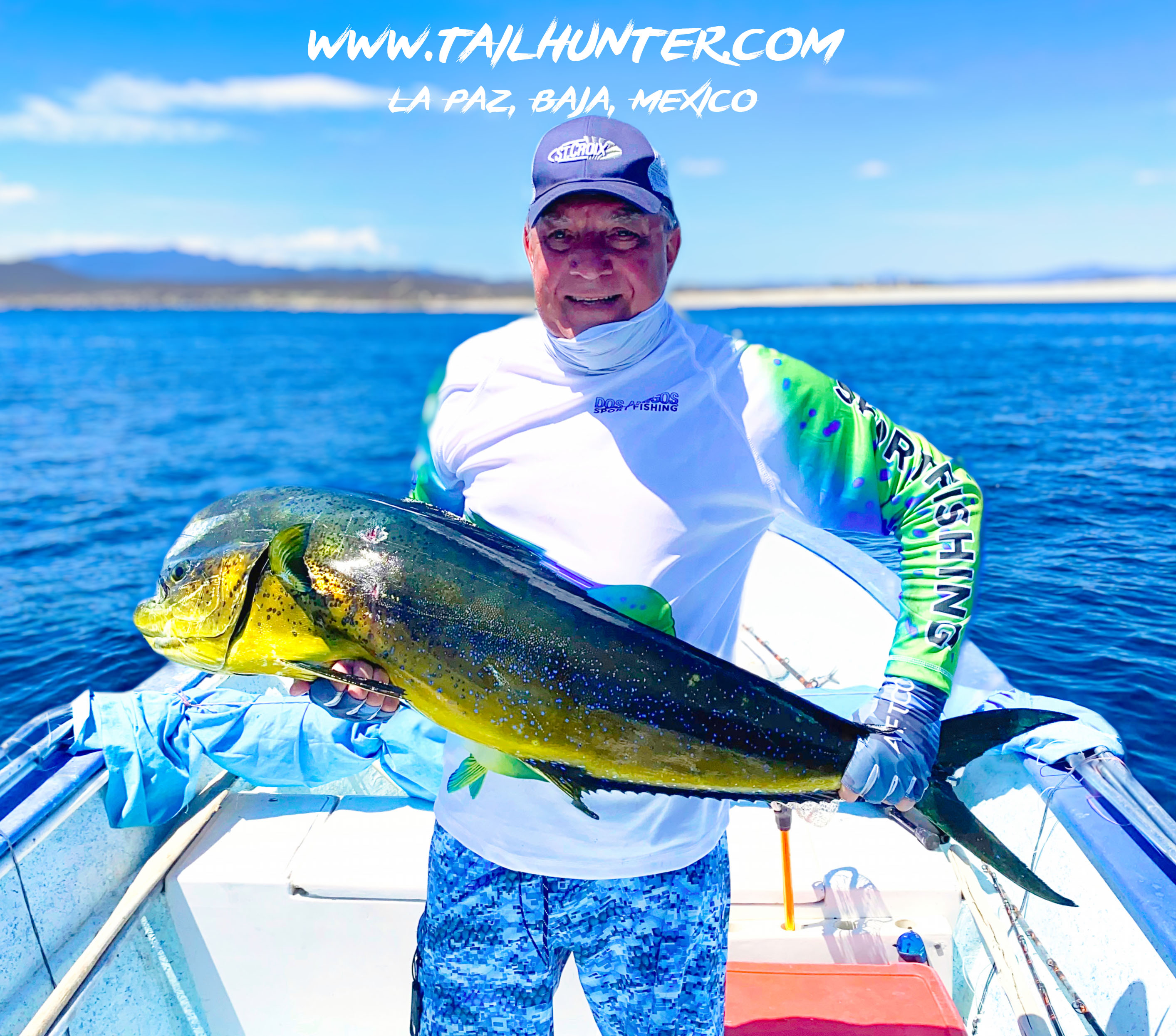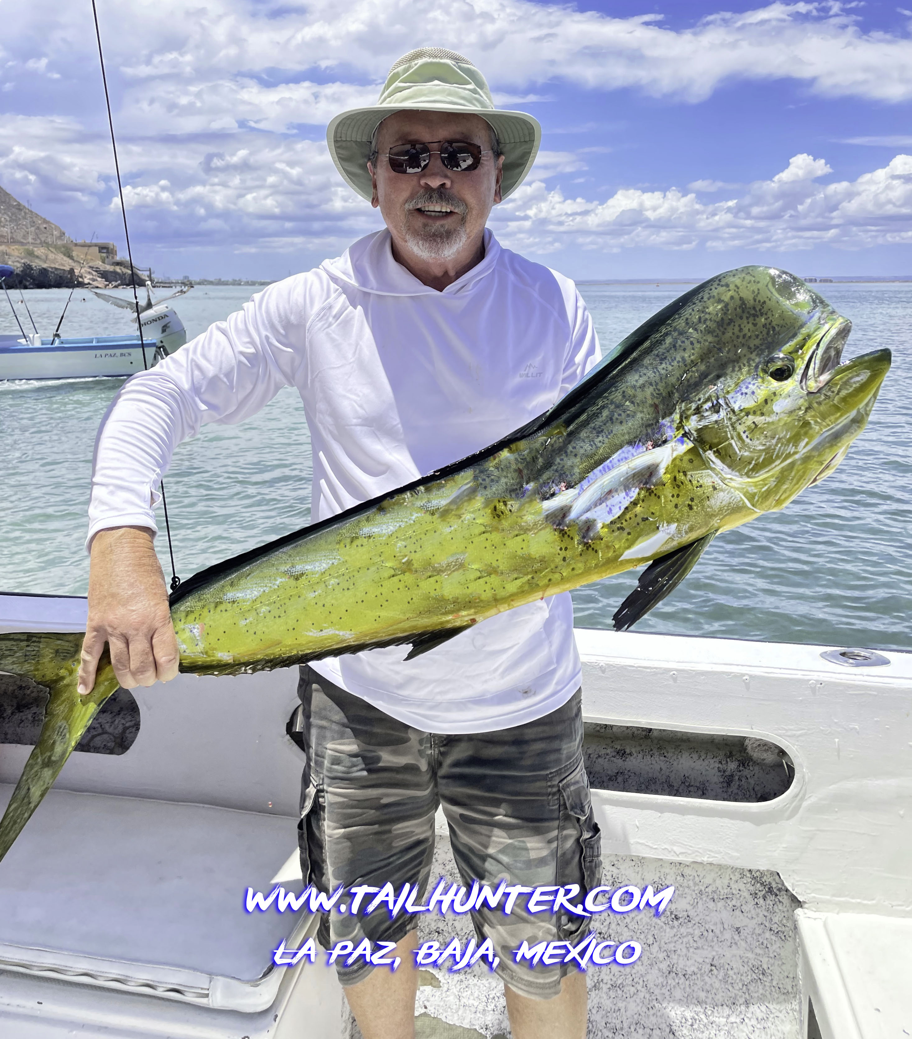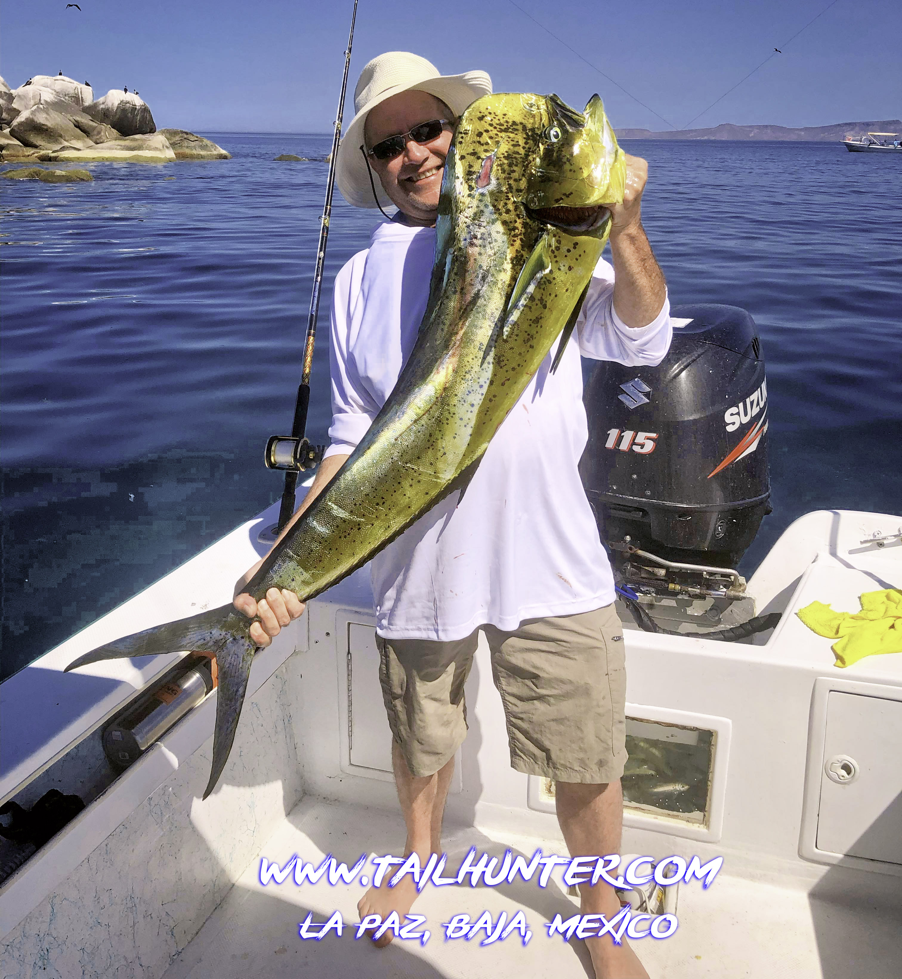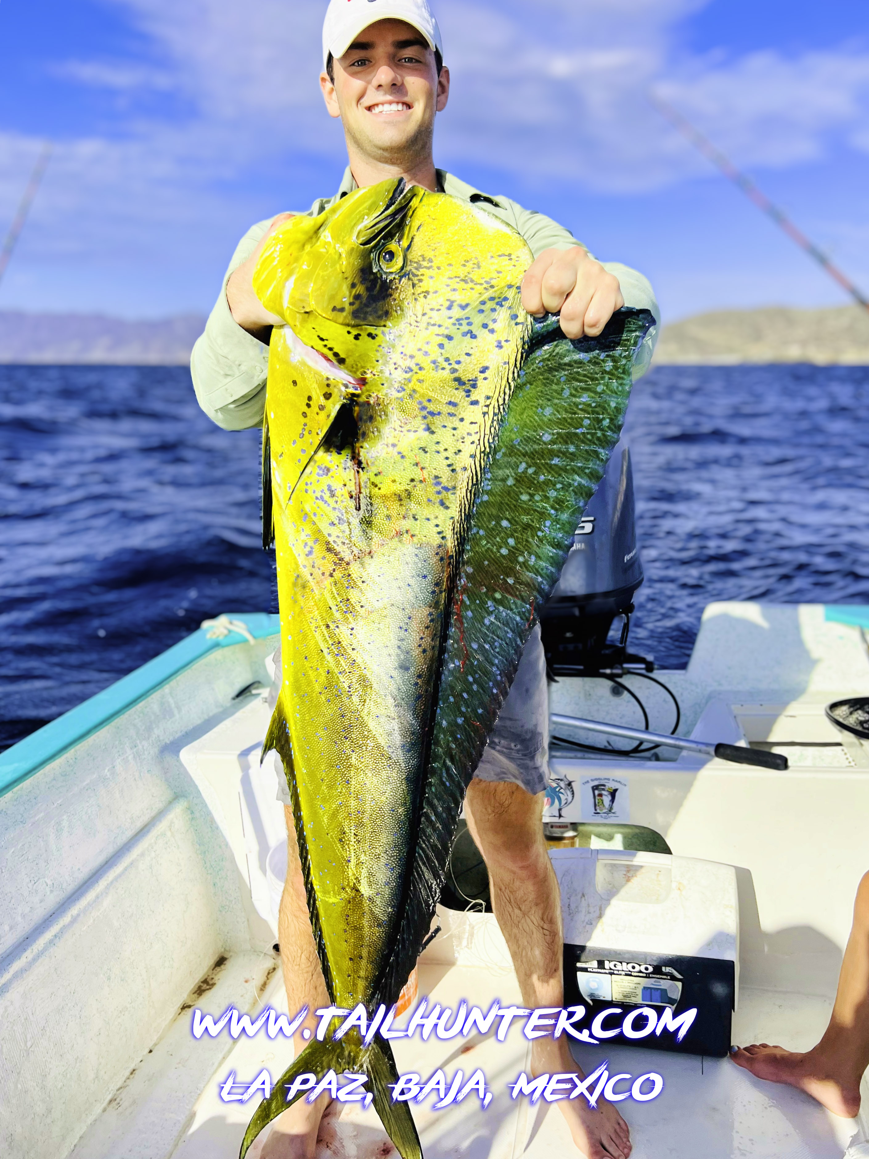Wow! When Captain Victor thinks you have a “50 pounds fish” that’s alot of credibility . Greg Hall on his first trip to see us from Portland OR with a beast bull dorado. Cerralvo Island in the background.