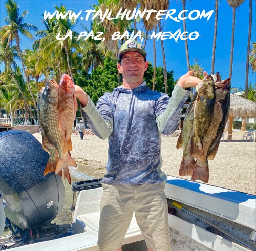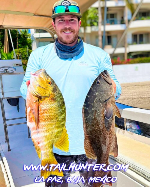 Some two-handed good eating for Chris Arechaederra holding a barred pargo and a cabrilla ready for the fillet table.