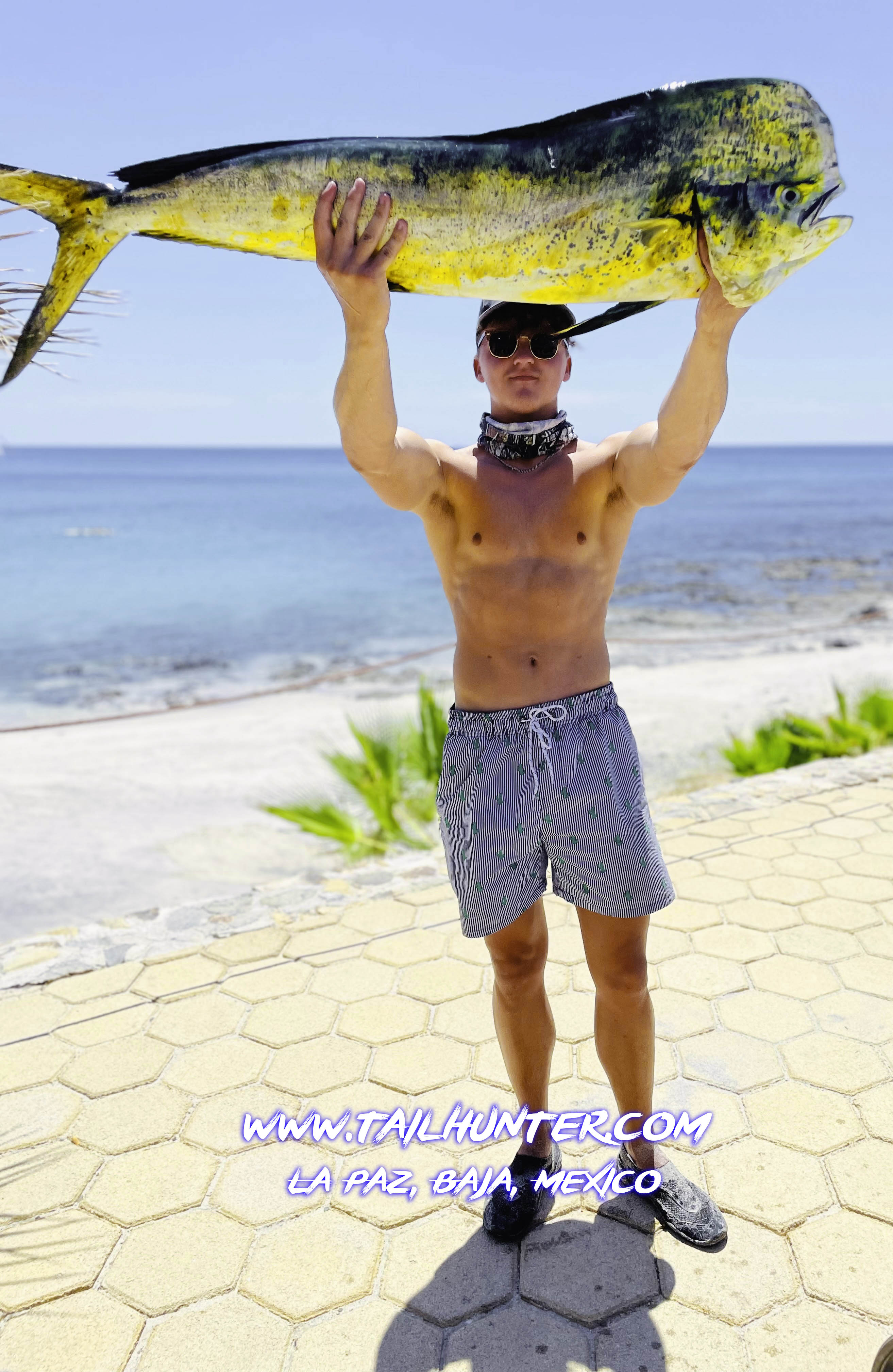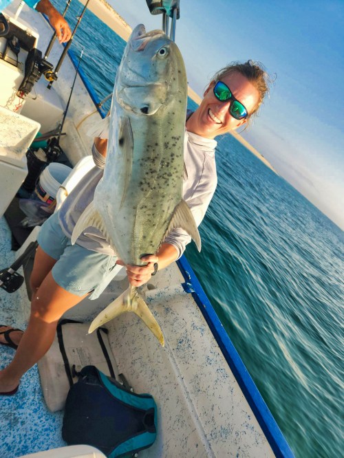 UH…OK…nice pose. Not a pose we see very often. Dax Wallis from Kentucky visiting at Rancho Costa in Bahia Muertos presses a bull dorado for a couple of reps. I used to look like this before covid.