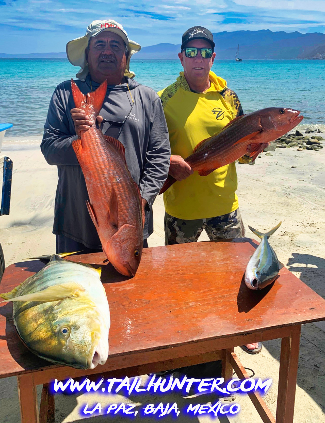 Mike Luna with Captain Victor on the beach. Check out the two nice pargo liso and the rainbow runner on the table, but the HUGE palometa (trevally) on the table is also a trophy fish!