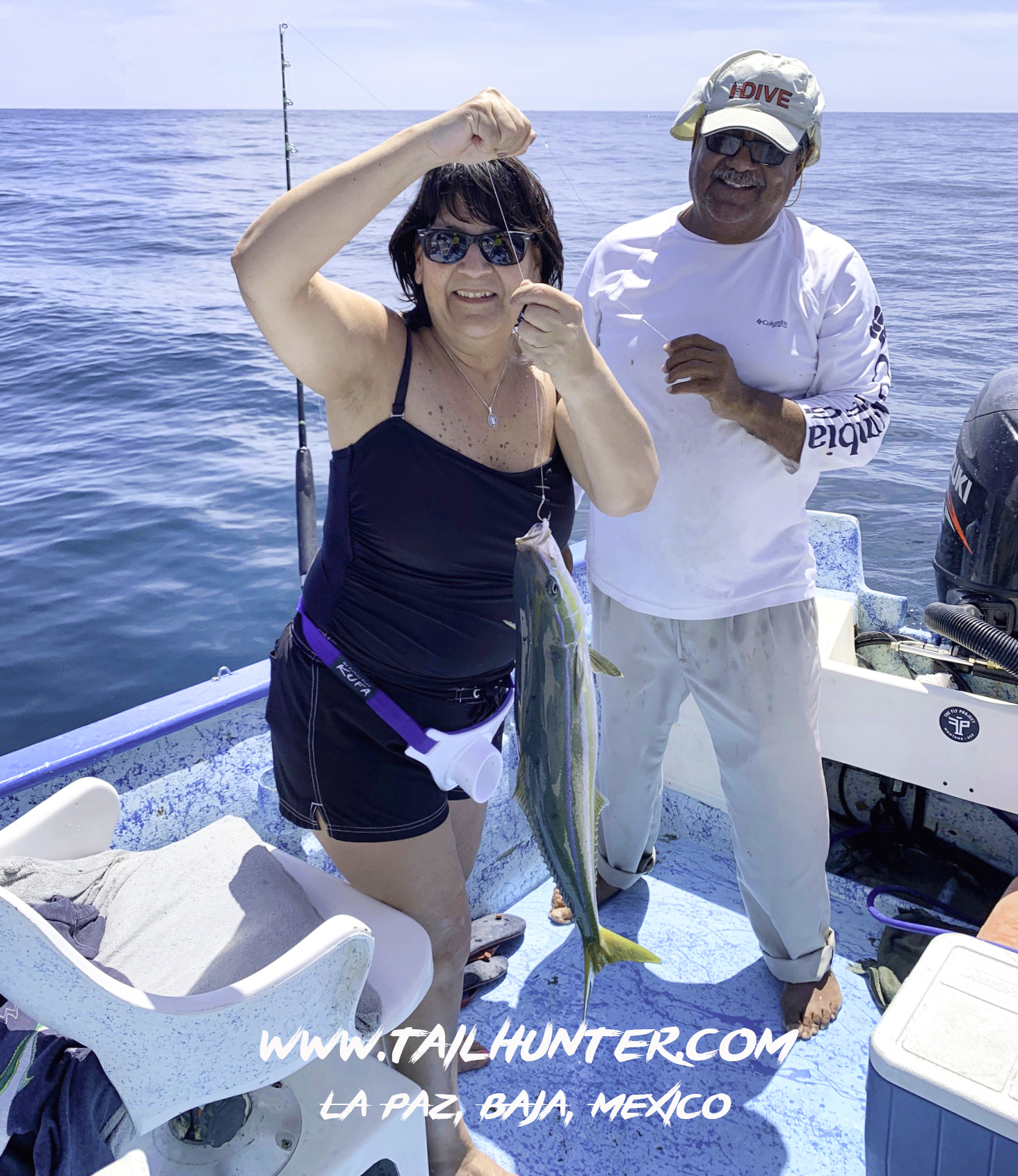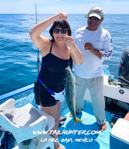 Captain Victor has a smile as he tries to help Rita Luna with her rainbow runner. Cousins to yellowtail, the fish are schooling up over the shallow areas right now and make great sashime and cooked up as well.