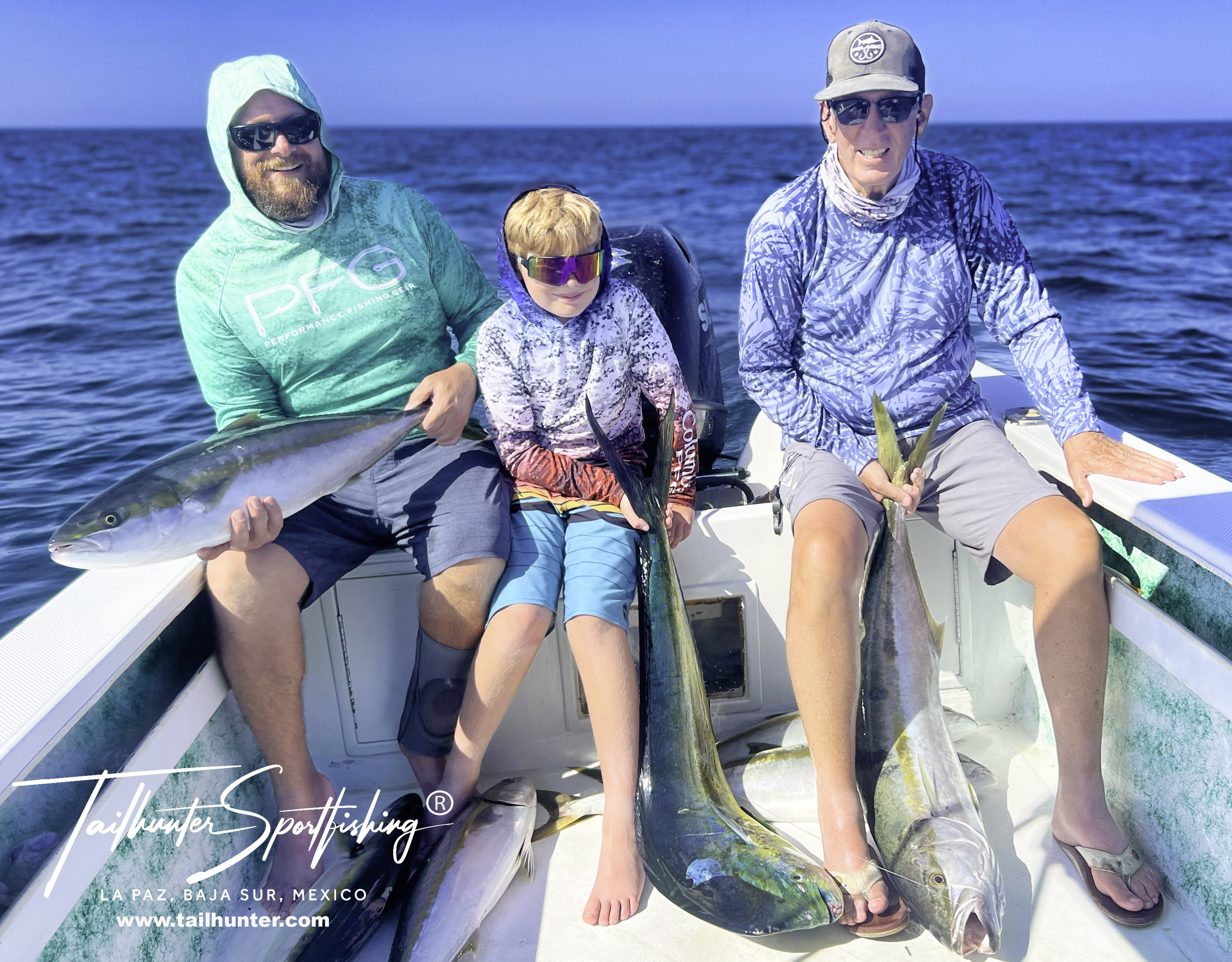 Tanner Pierson and son Braedon with Jim Bovee, our friends from San Diego with yellowtail and dorado fishing with our Tailhunter La Paz fleet.