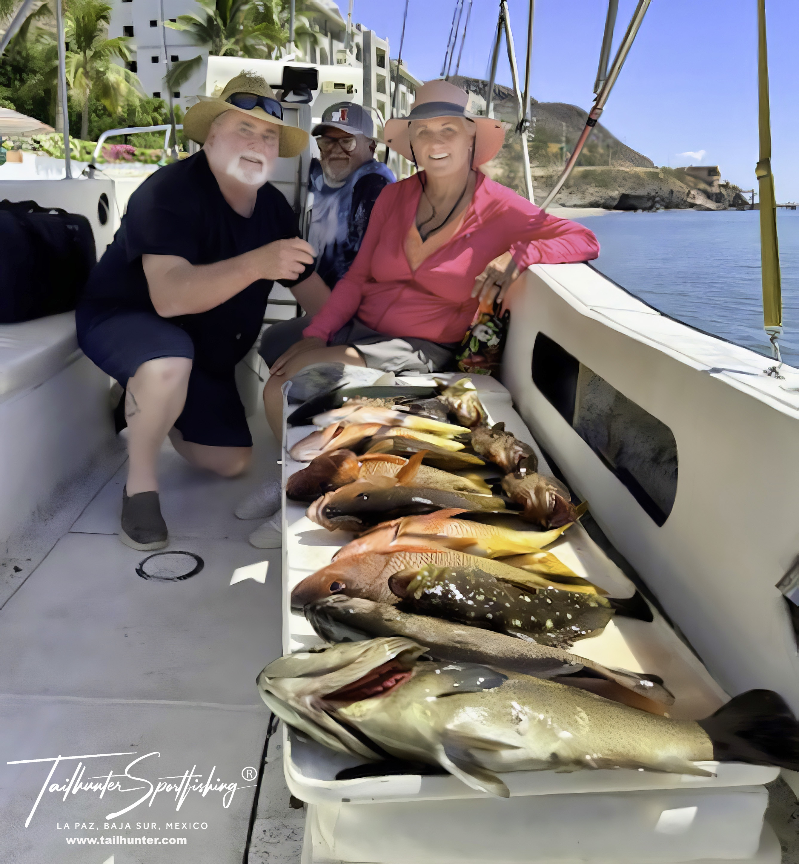 Pretty shot with the blue water of La Paz Bay. John and Gwyn Bailey with a quad of yellowtail for the fish box.