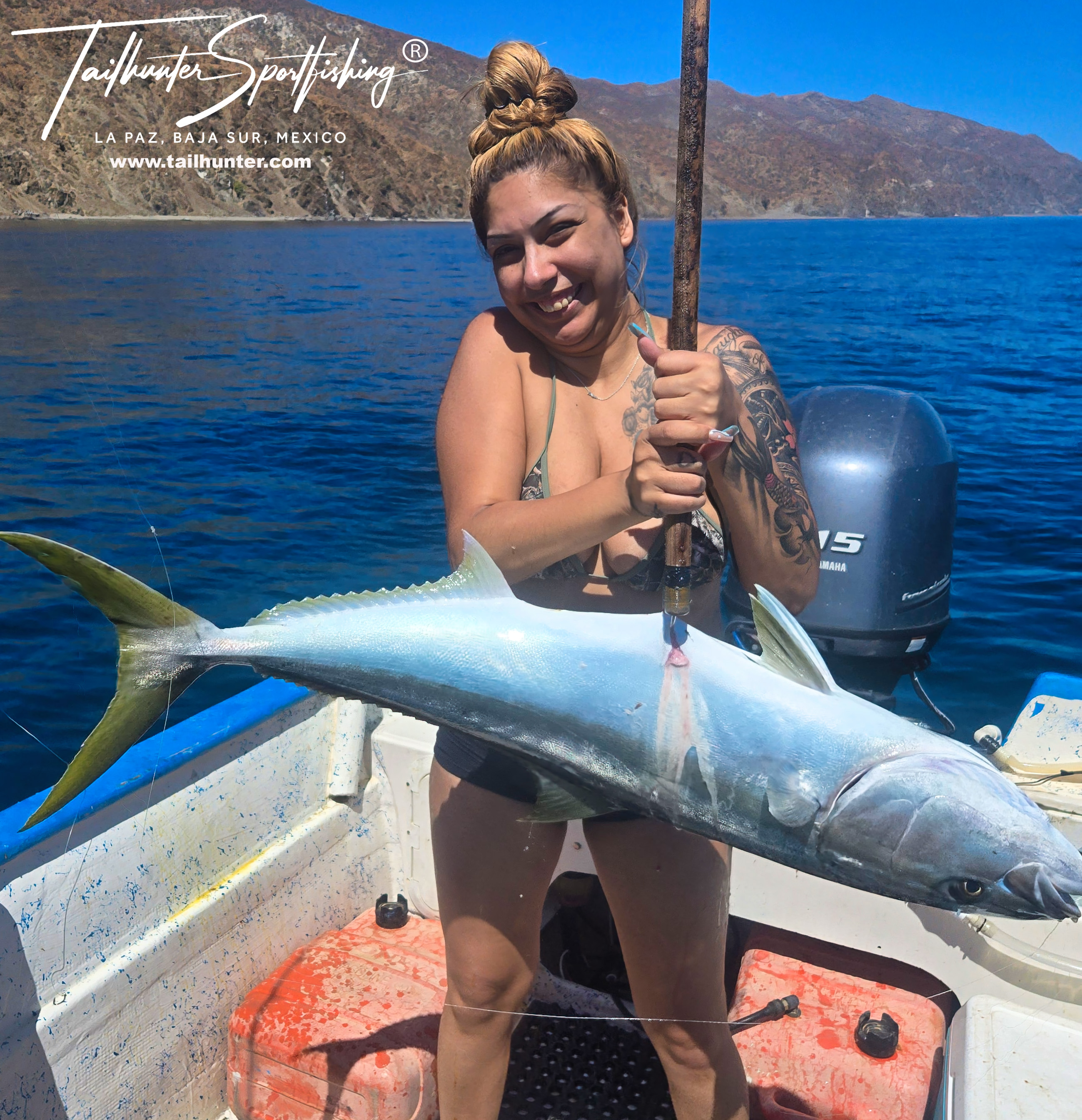 Happy girl! Marline Casillas and Captain Arcangel went all the way to the north end of Cerralvo Island. Fishing was sketchy, but this big yellowtail topped the day.