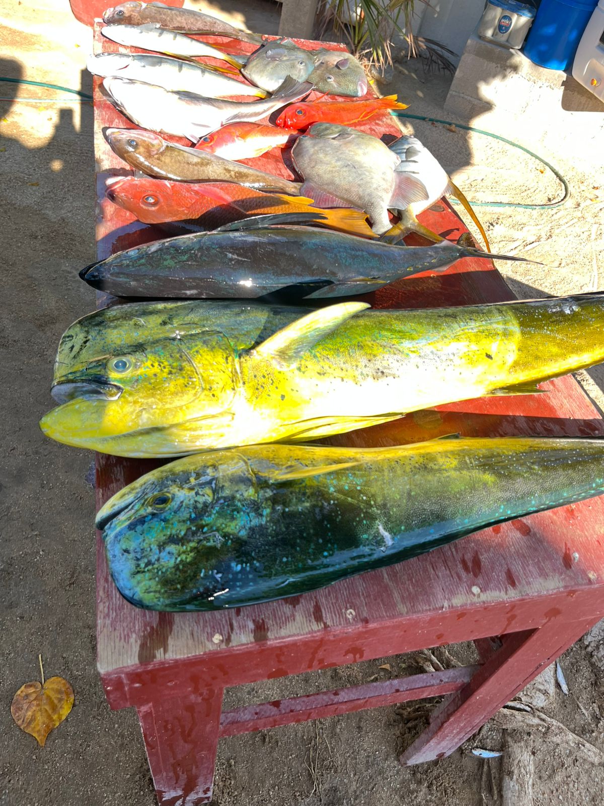 On the days when you can get out, there’s a surprising variety of both warm and cold water fish. Greg Wong was at Cerralvo Island and came back with alot of fish to clean! I see dorado, a tuna triggerfish, cabrilla, snapper and pompano!
