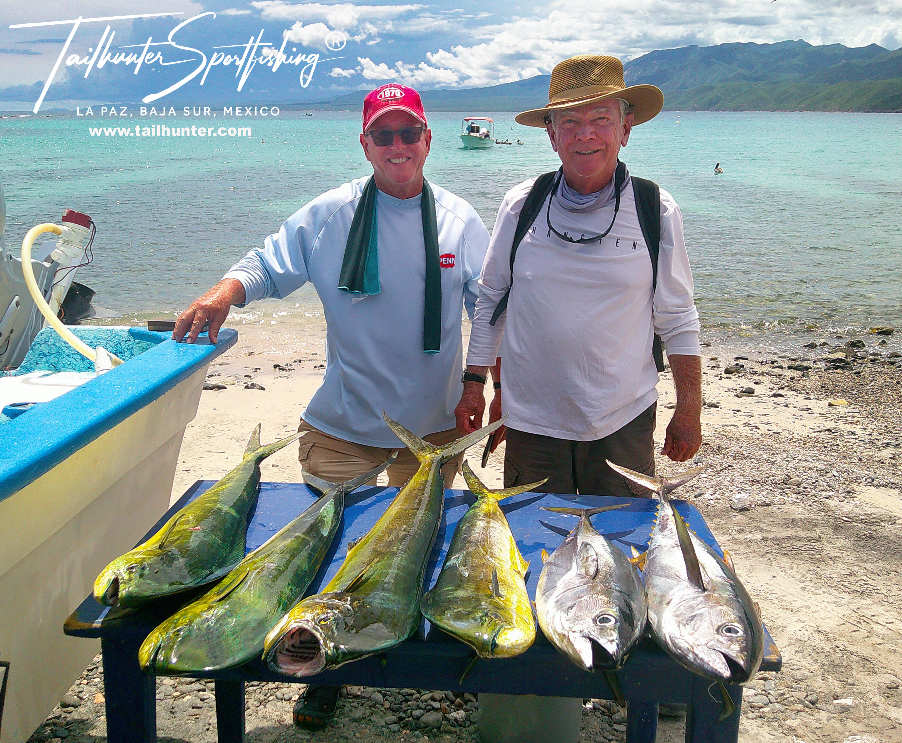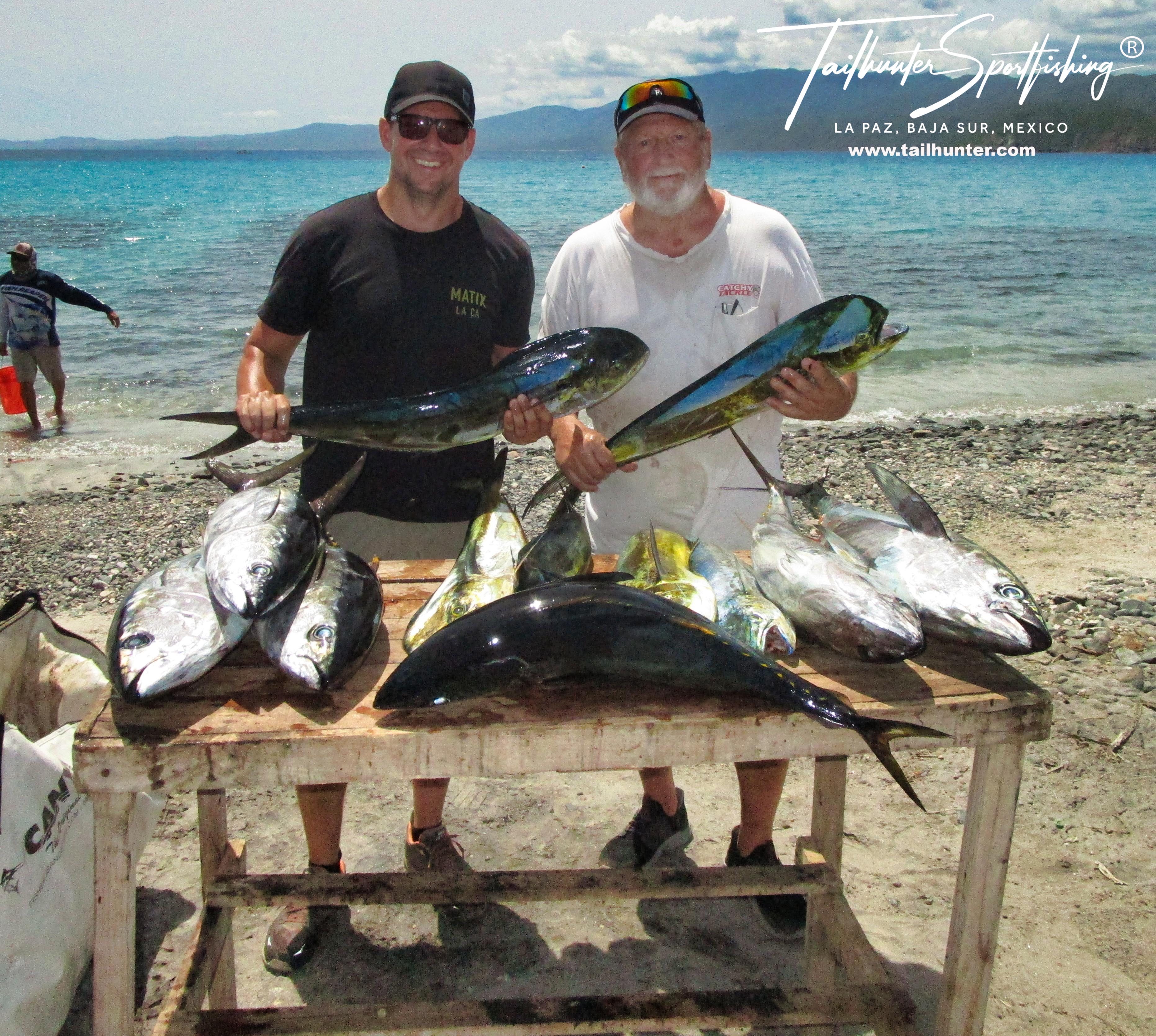 A pretty good day! Especially when the fish are only yards away from where you launch and you’re done early! Tuna showed up in Bahia Muertos just minutes from where we launch. Chris Binkley and Roger Laubscher stocked up on some tuna meat! Boats were done with tuna by 8 a.m.