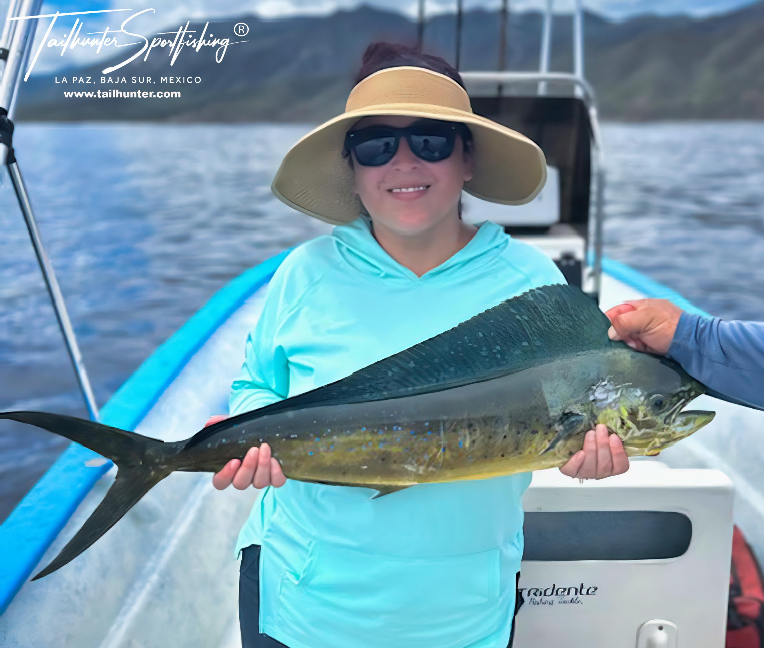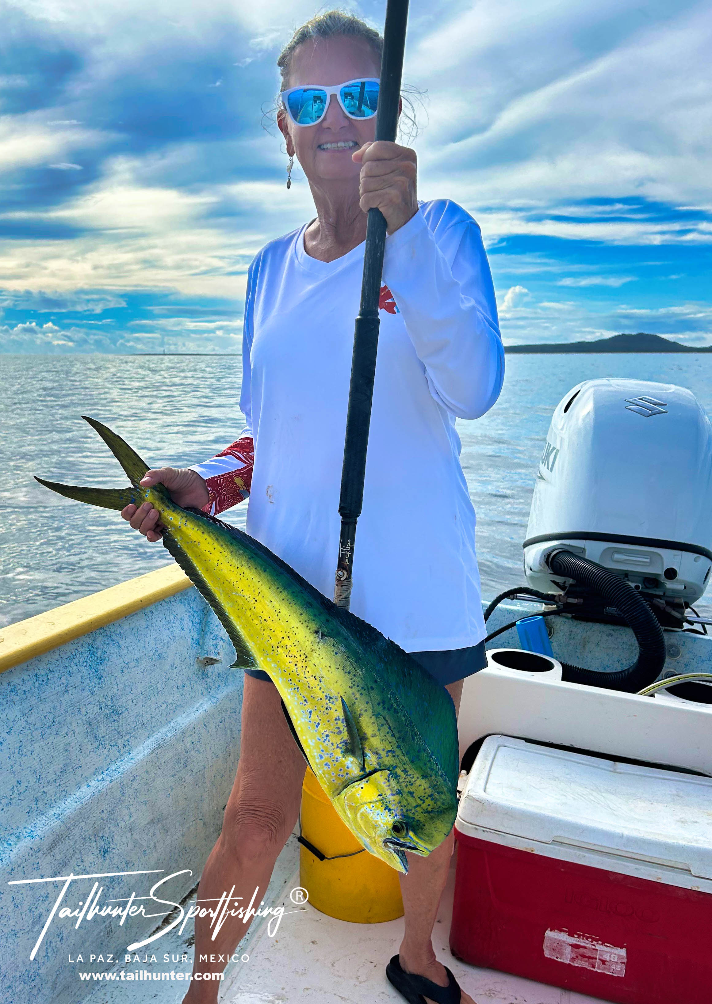 From Florida on her first visit with us, Cindy Ersch has a dorado on the gaff ready for some fish tacos and ceviche at our Tailhunter Restaurant.