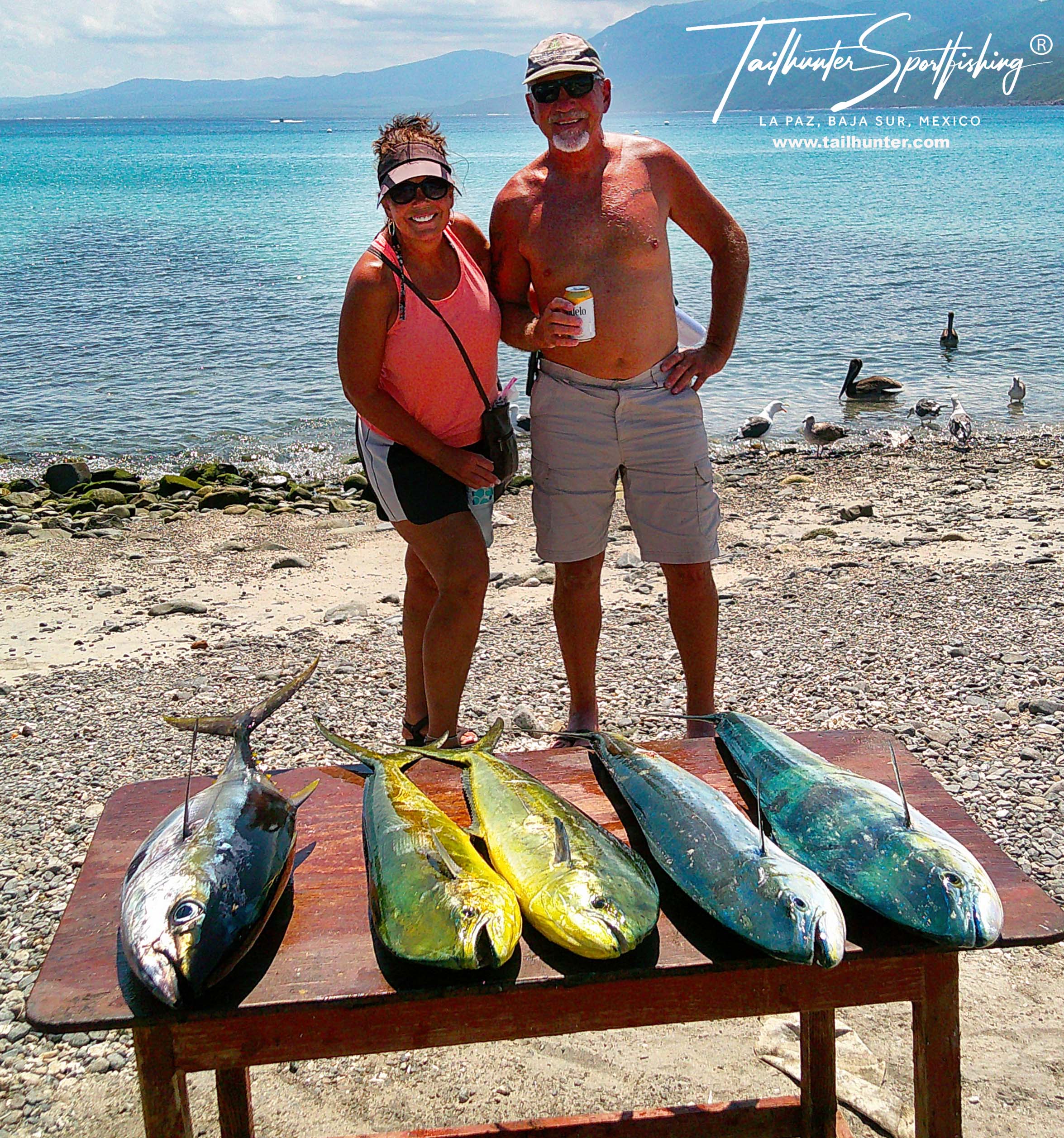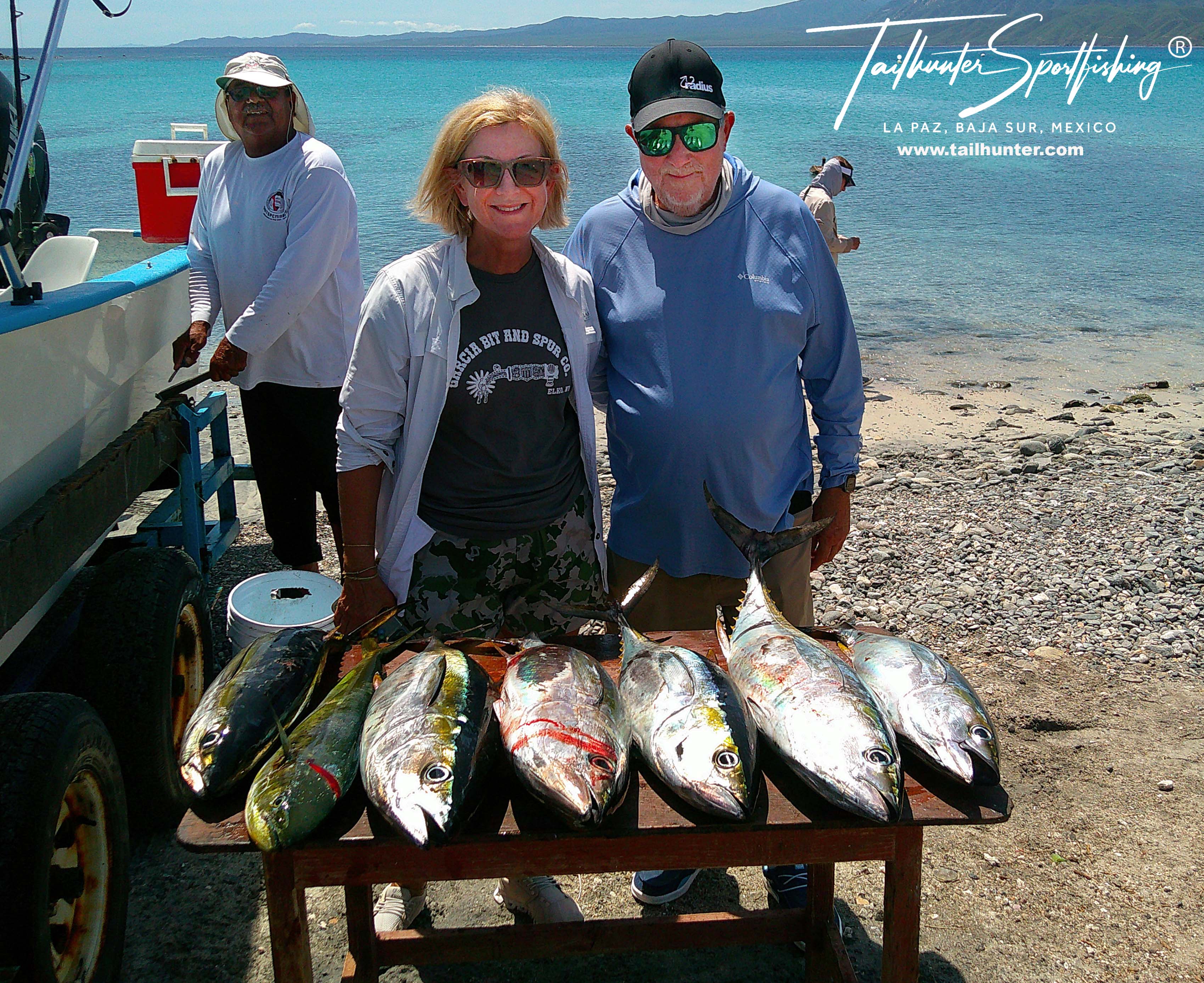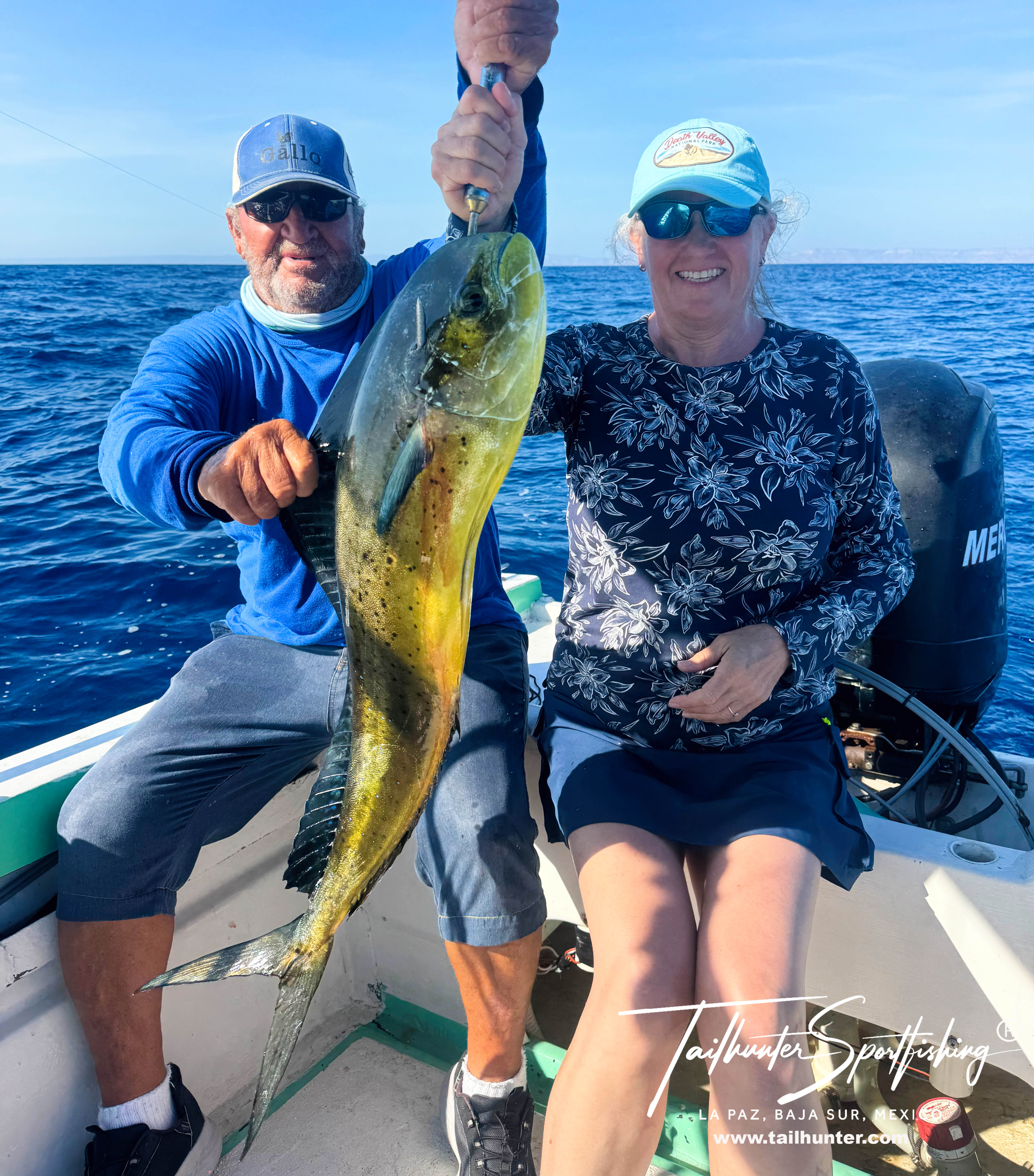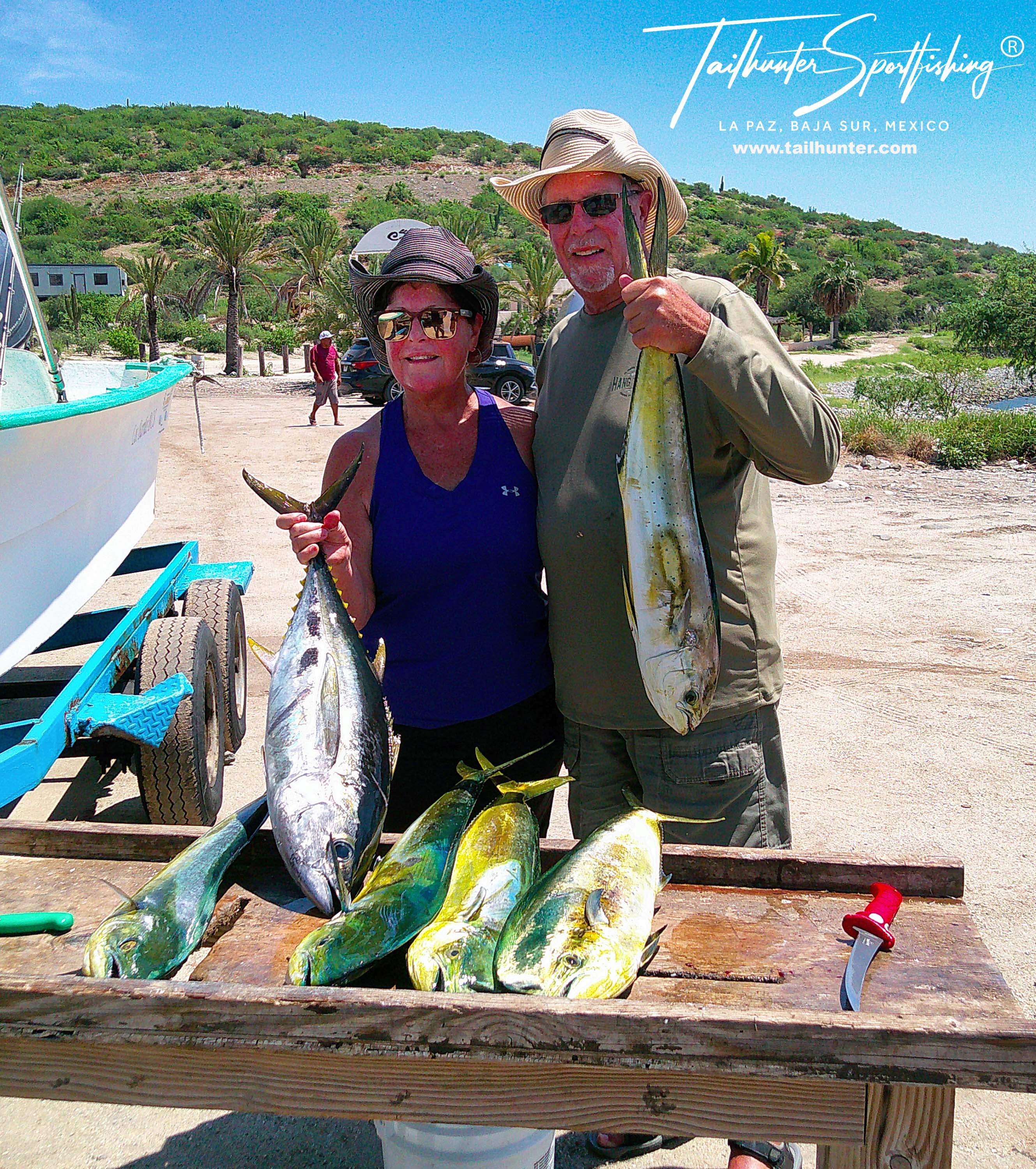 Love these two…Joe and Holly Moore!  With Captain Gerardo and the results of a nice day on the water with some slugger yellowfin tuna and a big bull dorado.  Joe and Holly are way fun. Visiting for the first time from Oklahoma.