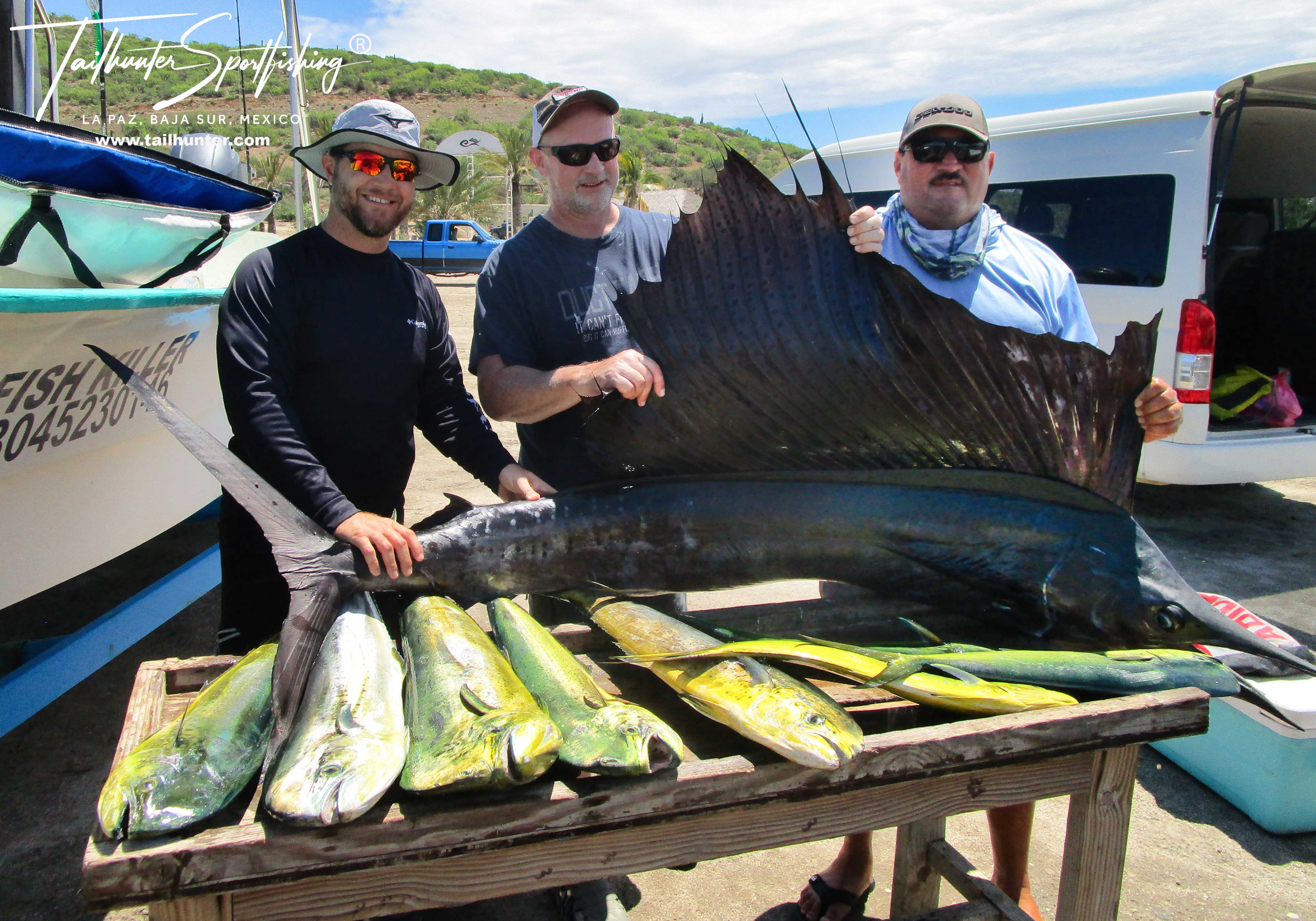 Captain Hugo and Aaron Klingsmith give Joe Zorack a hand with his sailfish as they pose with a nice rack of dorado to clean. The sailfish was not able to be released and the meat was distributed. A good day with great action. The guys are from Colorado.
