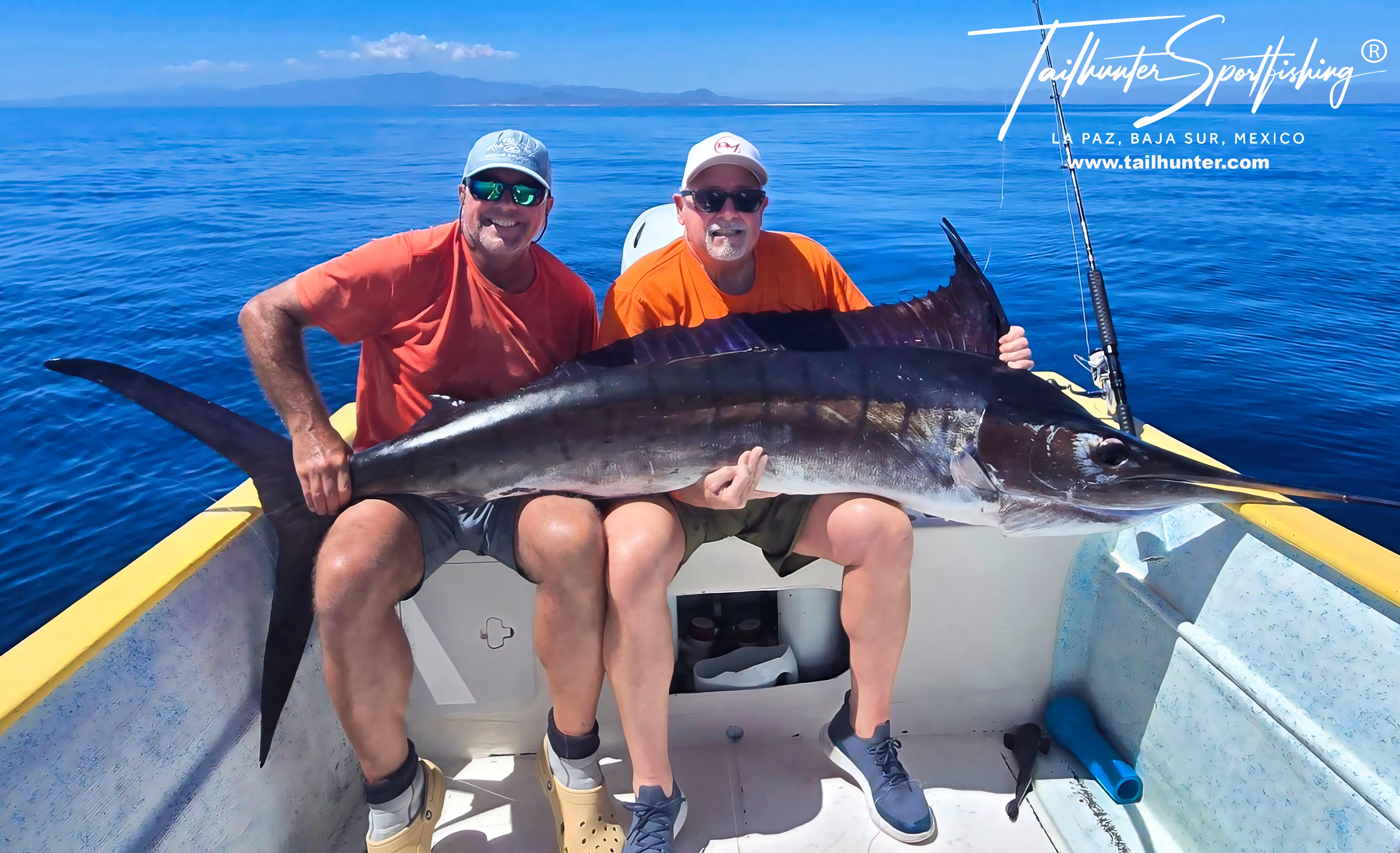 Maybe, it’s because both guys showed up accidentally with orange shirts! Mike and Darrell were with Captain Pancho at the south end of Cerralvo Island and massive 80-100 pound yellowfin tuna started busting out all around them. They baited up and flipped their hooked sardines into the boils and this big-shouldered striped marlin picked up both lines and took off! They both fought the fish four about 20 minutes on both rods and were able to release it swimming strong . But by then, the marlin had pulled them off the tuna spot! Great photo and story! Check out the flat water!