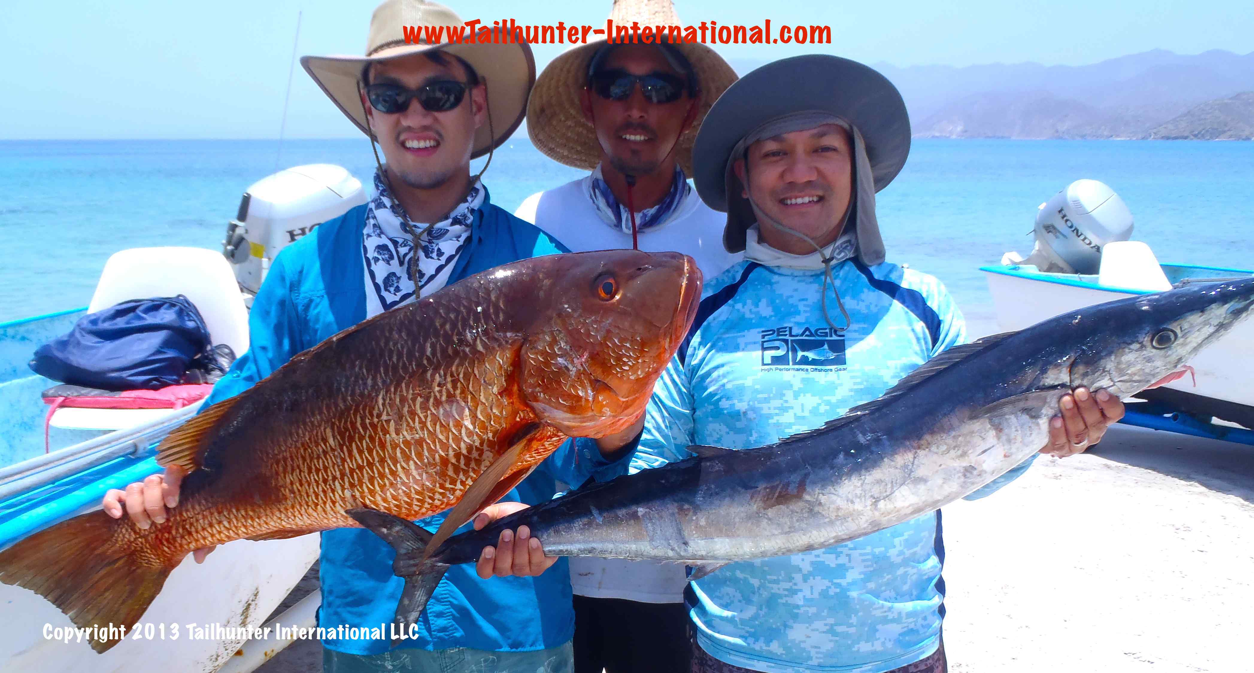 Pretty good for a first day fishing and first time to La Paz for brothers Andew and Ian Vale Cruz from San Diego. They got a variety of fish including these two trophys. Andrew holds up a big dog-tooth snapper and Ian has his first wahoo. Captain Pancho fails the photo bomb!